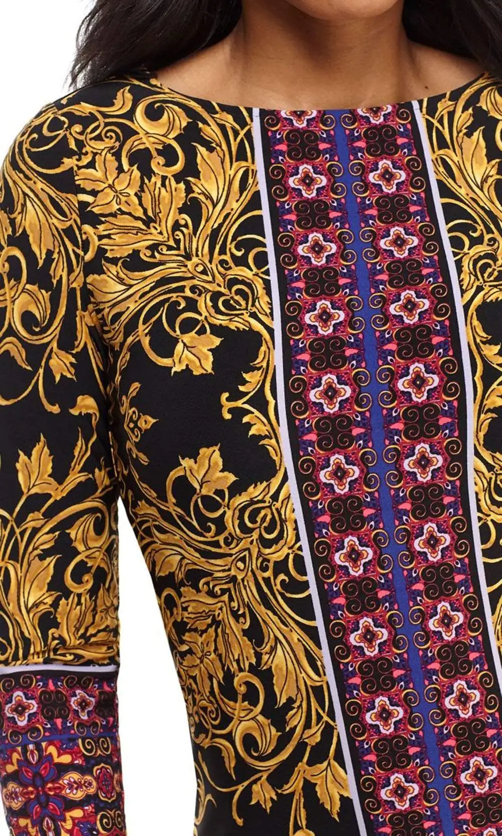 Enhance your visual appeal in this London Times T4688M. This shift dress presents a geo pattern complemented with a comfortable, no zipper design that will keep you comfortable all day long. Features a bateau neckline with quarter sleeves. Pair with your favorite blazer and this London Times creation is simply perfect for a work wear update.
