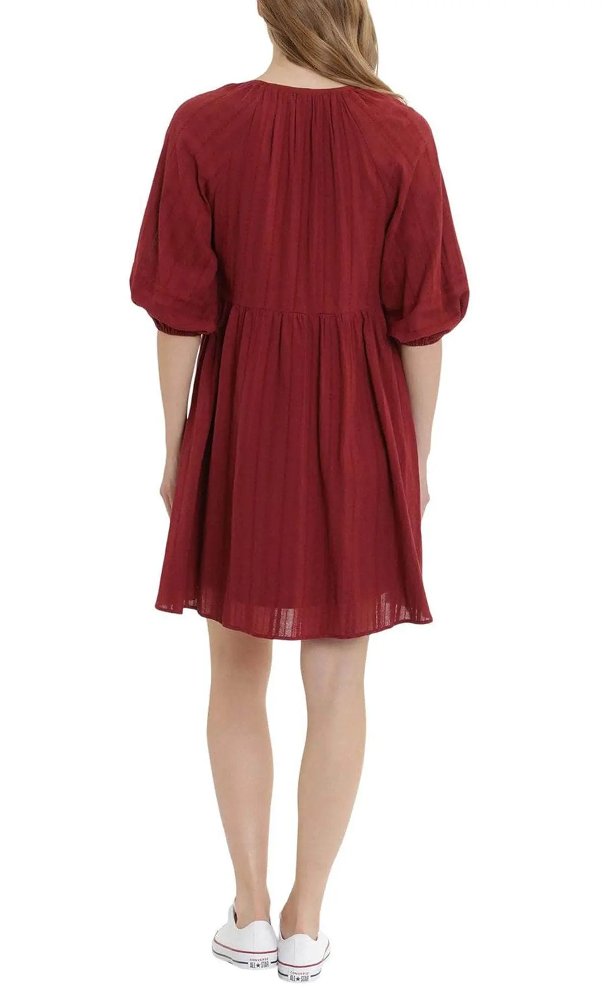 Be tantalized with the utterly feminine and relaxed appeal of this London Times T5795M creation. Rendered with stripe like textures on a cotton weaved silhouette, this beauty shows a v-neckline with gathered ruching. Styled with oversized puff sleeves and elastic cuffs, this ensemble has a full and a skirt that forms an A-line silhouette with side pockets and a short hemline. Charm everyone like a breeze on a spring day in this sweet London Times masterpiece. Models are wearing the Pesto and Ruby Wine colors.