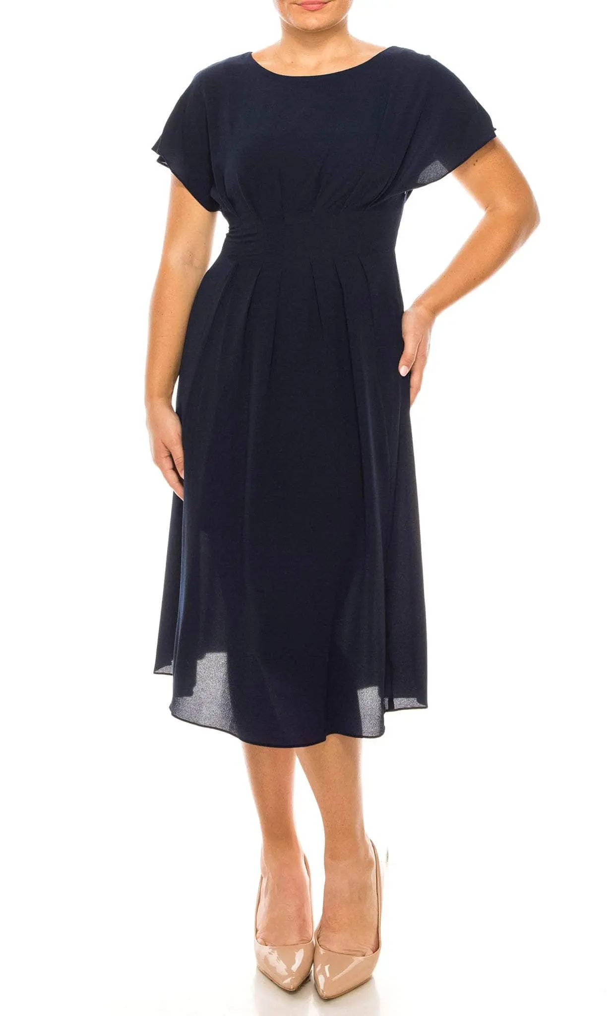 Dress to impress on your next formal event in this simple but captivating London Times T6318M. An elegant jewel neckline highlights your beauty on this flowy chiffon day dress. It features short dolman sleeves and an empire waist, detailed with subtle pleats and a thick waistband. Perfect for any occasion, the airy skirt follows an A-line silhouette and flows beautifully with every step. Look sophisticated and mature in this simple yet chic London Times T6318M Models are wearing Fuchsia and Navy colors.