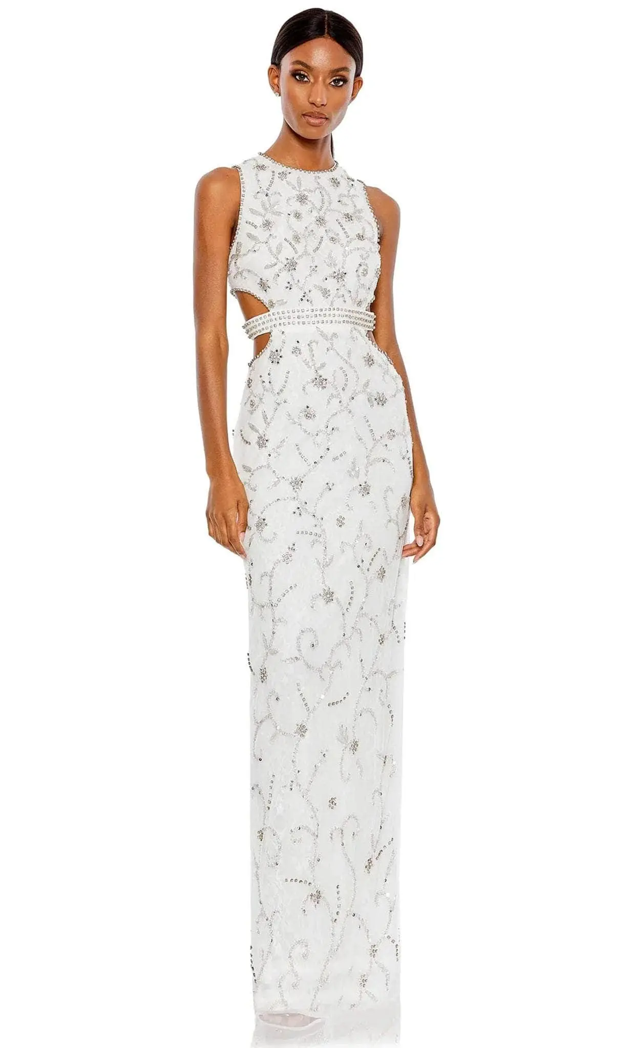 Wearing this Mac Duggal 10873 dress, you will enchant the affluent audience when you enter the room. The sleeveless bodice is fitted and crowned with a high neckline, and it has side cut-outs that reveal your skin. It is lavishly embellished with sequin and botanical-inspired bead swirls. A belted rhinestone encrusted waist brings an elegant look and the skirt accented with a back slit, which parades in a column silhouette and flows magnificently to a full-length hem, is fastened at the back by a center zipper closure. Never waver from the limelight in this Mac Duggal 10873 masterpiece. Model is wearing White color.