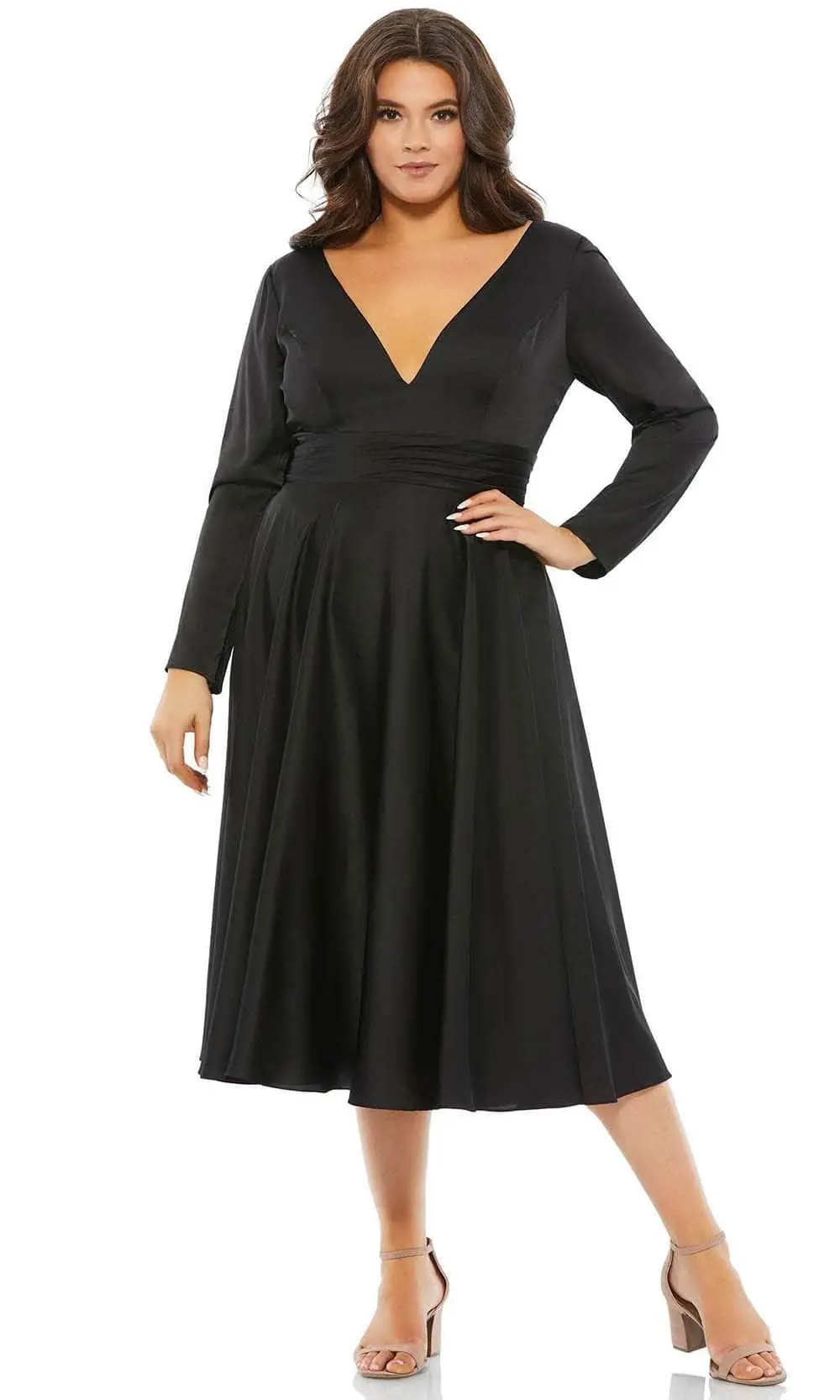 Shine with immaculate elegance in this gorgeous creation by Mac Duggal 67907. Gorgeously tailored with princess seam to hug your figure, this dress flaunts a V-neckline and long sleeves. Fashioned in satin fabric, the whole ensemble presents a modest style with its full back and A-line skirt that runs at a tea length hem. This Mac Duggal dress is designed with sophistication in mind, it is your perfect choice for prom, pageant or any special event. Model is wearing Black, and Burgundy colors.