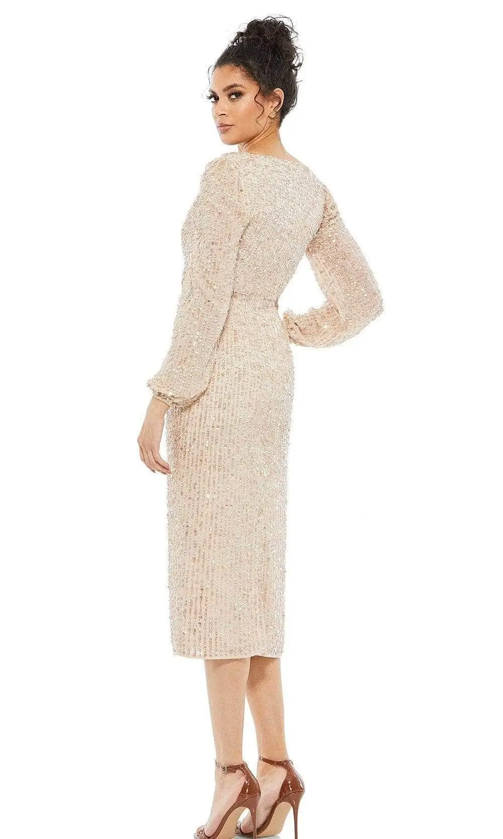 | Details: | Sequins, Long Blouson Sleeves, Full Back, Zipper Closure, Back Slit, Tea Length Hemline |