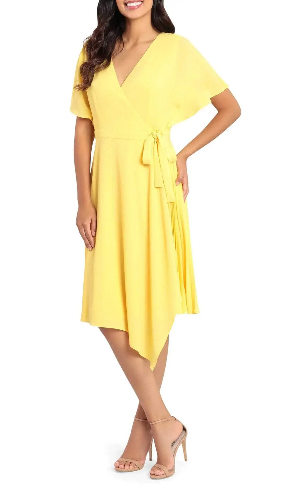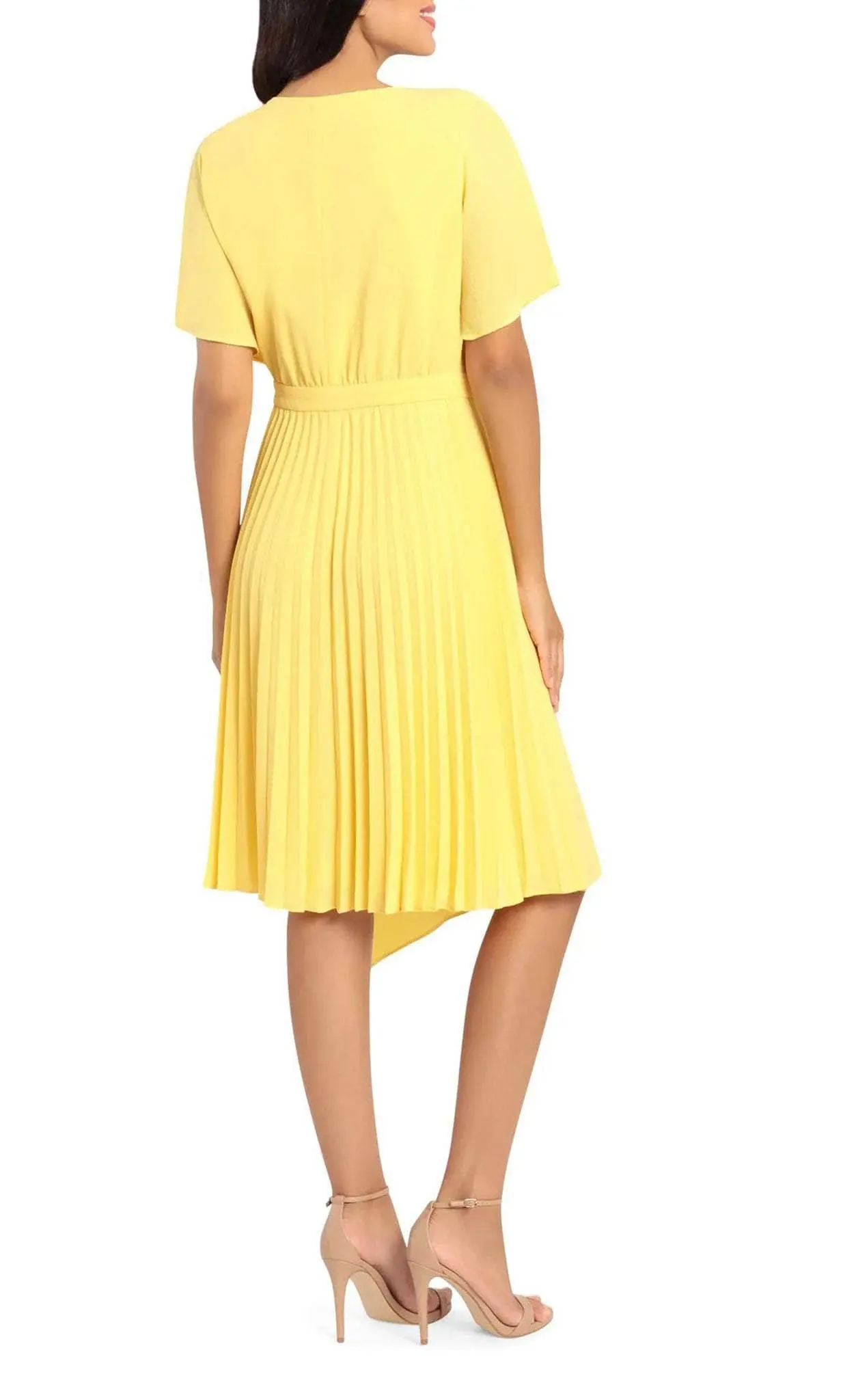 Wear this Maggy London G4631M to create an elegant and fascinating grand entrance. This gorgeous dress is gorgeously tailored from crepe fabric and crafted magnificently with clean seams. A waist tie cinched the natural waistline. The faux-wrapped bodice is crowned with a V-neckline and framed with short sleeves. Grab the attention of the crowd in this simple yet stylish dress, which shows a pleated skirt that reveals an A-line silhouette. Dress elegantly for your upcoming special event in this Maggy London G4631M masterpiece. Model is wearing Daffodil color.