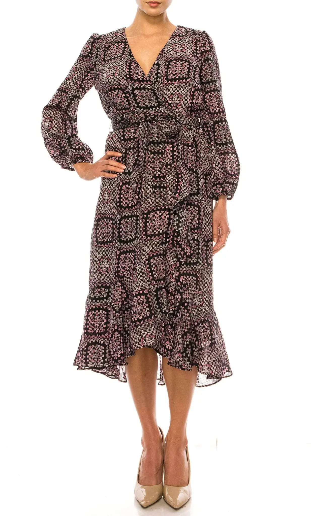 Be the center of attention and make an unforgettable impression in the stunning Maison Tara 95611M gown. This exquisite creation features a faux wrap design that elegantly drapes across the body, accentuating the surplice neckline and puff long sleeves. The printed square patterns adorning the entire gown add an element of sophistication, while the detachable sash belt provides a customizable fit that flatters the figure. The midi skirt boasts a ruffle hemline that gracefully cascades to the floor, enhancing the column silhouette. Whether attending a formal soirée or an extravagant event, this Maison Tara 95611M gown is the epitome of elegance and is guaranteed to turn heads. Model is wearing Black Blush color.