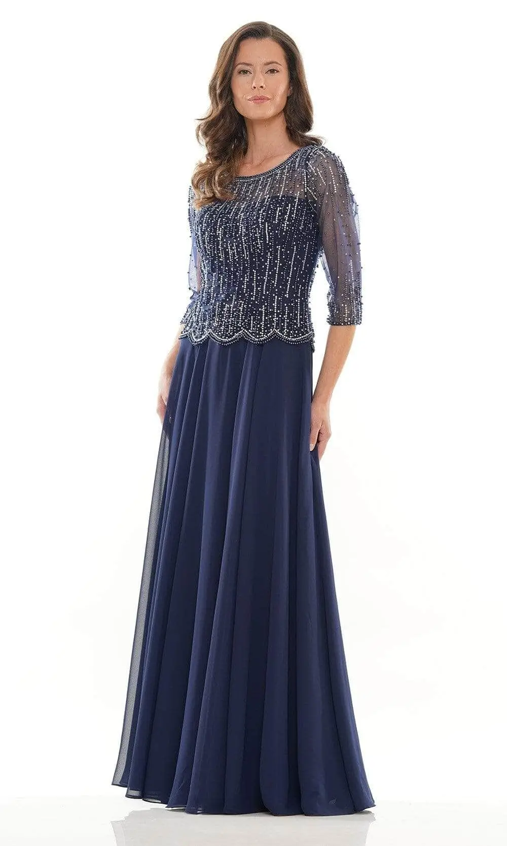 This dress showcases a scoop neckline supported by half sleeves in a bead-embellished top. Revealing an A-line silhouette, this also fashions a full back with back zipper closure to complete the look. Models are wearing the Grey, Navy and Slate Blue colors.