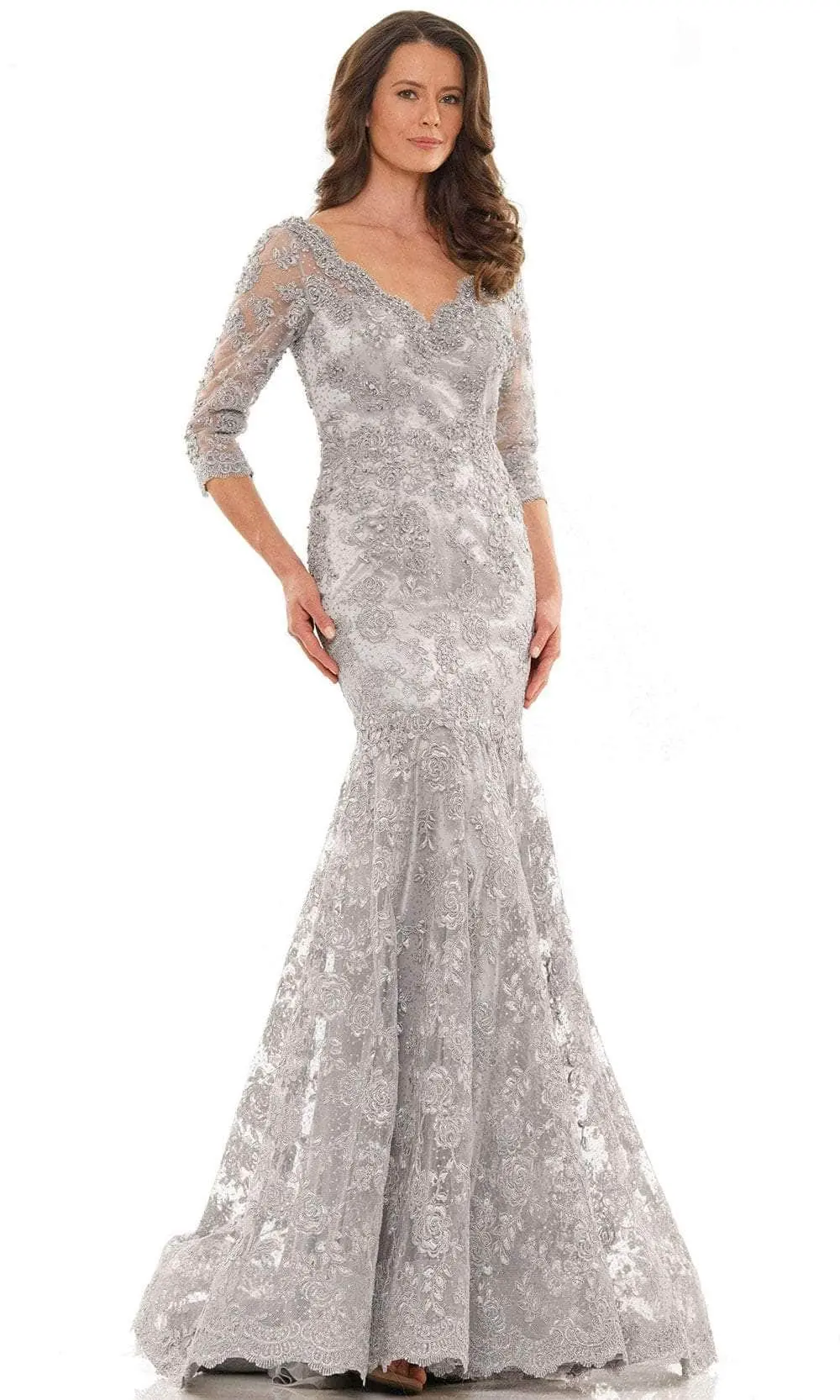 You are sure to be the life of the party when you are wearing this dazzling Colors MV1168. The V-neck neckline that supports the bodice is tailored in lace fabric and fashioned with 3/4 sleeves for a fashionable look that will captivate everyone as you go through the crowd. There is a back zipper closing for enhanced security. The column silhouette adorned with ruffle flutters down into a beautiful train that glides over the hips. Exhibit your softer side in this delightful evening gown from marsoni by Colors dress. Models are wearing Deep Rose, Gold, and Silver colors.