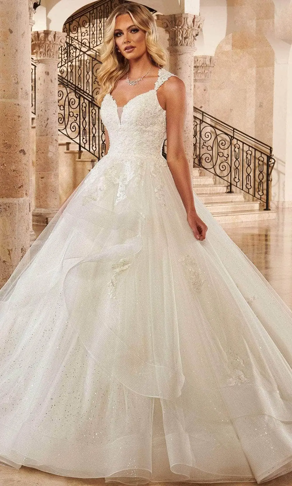 Parade your elegant and classy style with this stunning Mary’s Bridal MB6090 dress. Tailored in a sleeveless deep sweetheart neckline and an open back with lace-up tie, this gown is crafted in a glittered tulle fabric and ornated with beautiful applique embroideries. An elaborated ballgown skirt flows stunningly in a floor length hem with a horsehair hemline. A royal length cape or a matching bolero jacket can be paired this beautiful gown. This Mary’s Bridal design is perfect for any wedding themes. Mary’s bridal dresses have the widest range of styles, patterns and colors to choose from. Depending on your body type and skin complexion you can pick any dress as per your preferences. Model is wearing Ivory color.