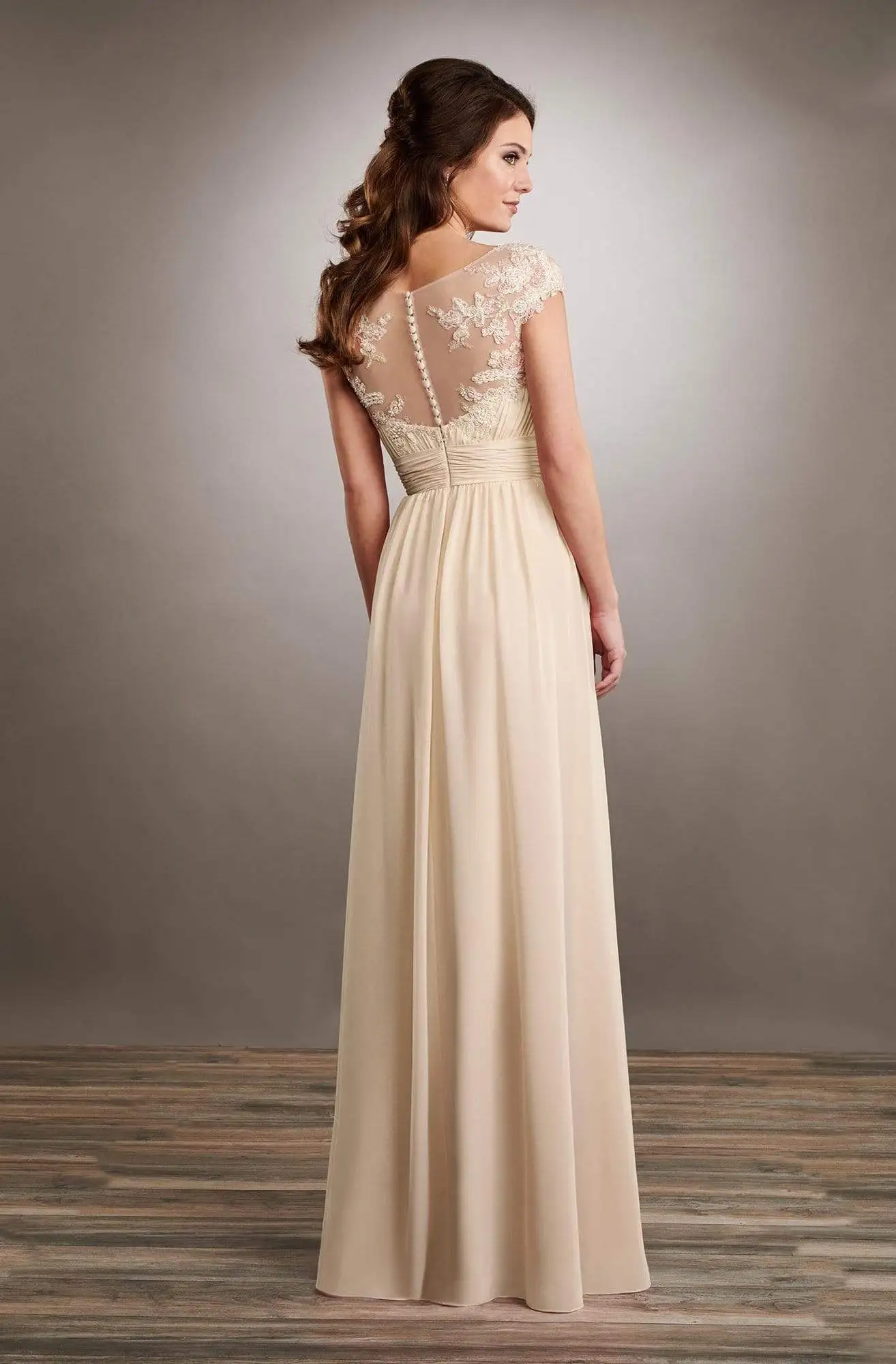 Traditional style gets a glam twist in a sophisticated dress from Mary’s Bridal MB8059. Fashions a V-neckline with lace cap sleeves. The dress is designed with a draped bodice and is accented with covered buttons at the back. The chiffon skirt flourishes a full length sheath silhouette. Dare to show off your style in a fashionable dress from Mary’s Bridal.