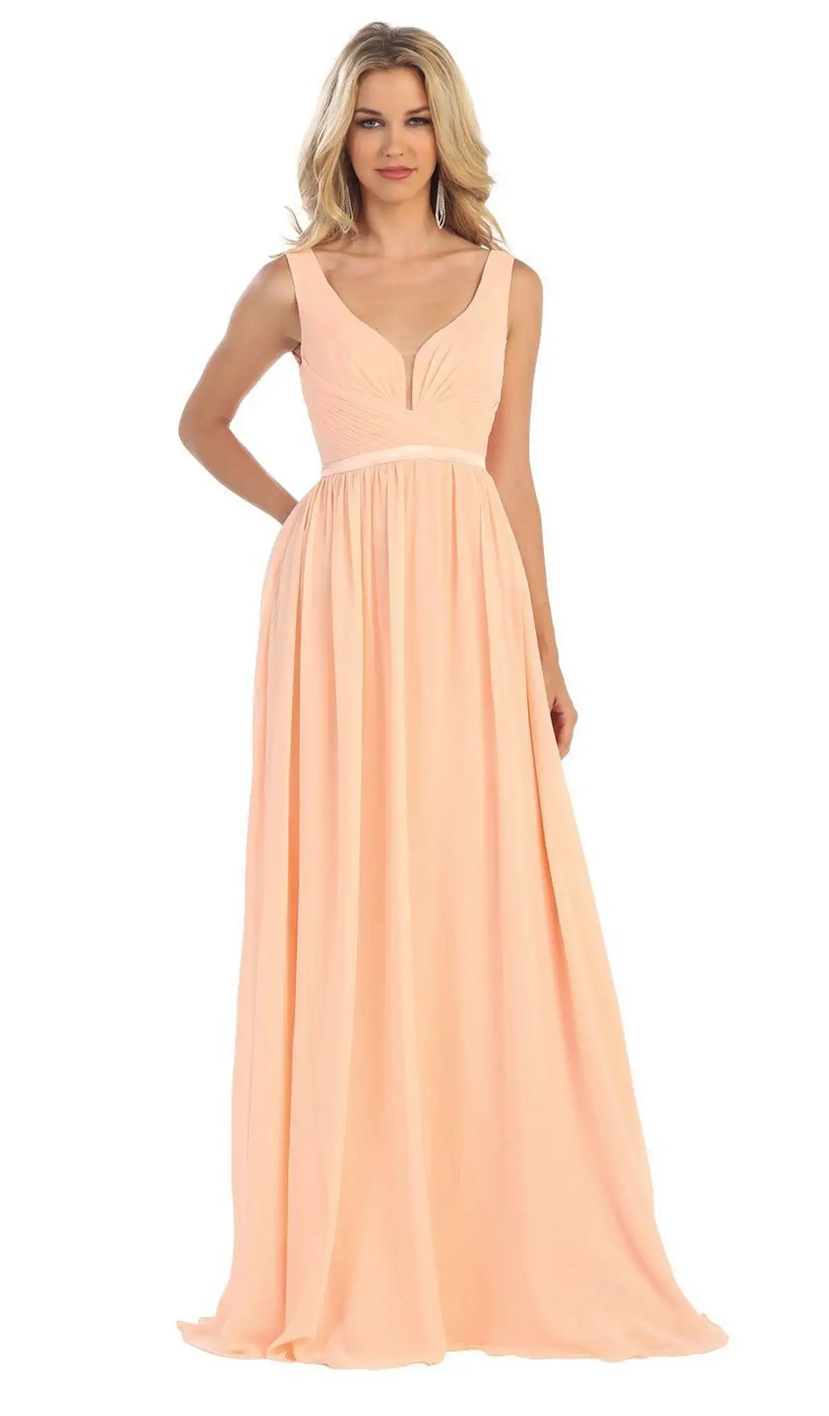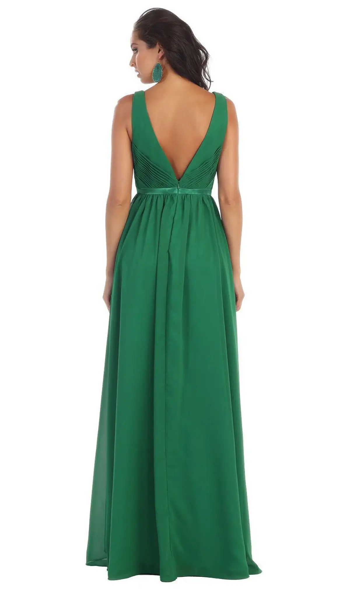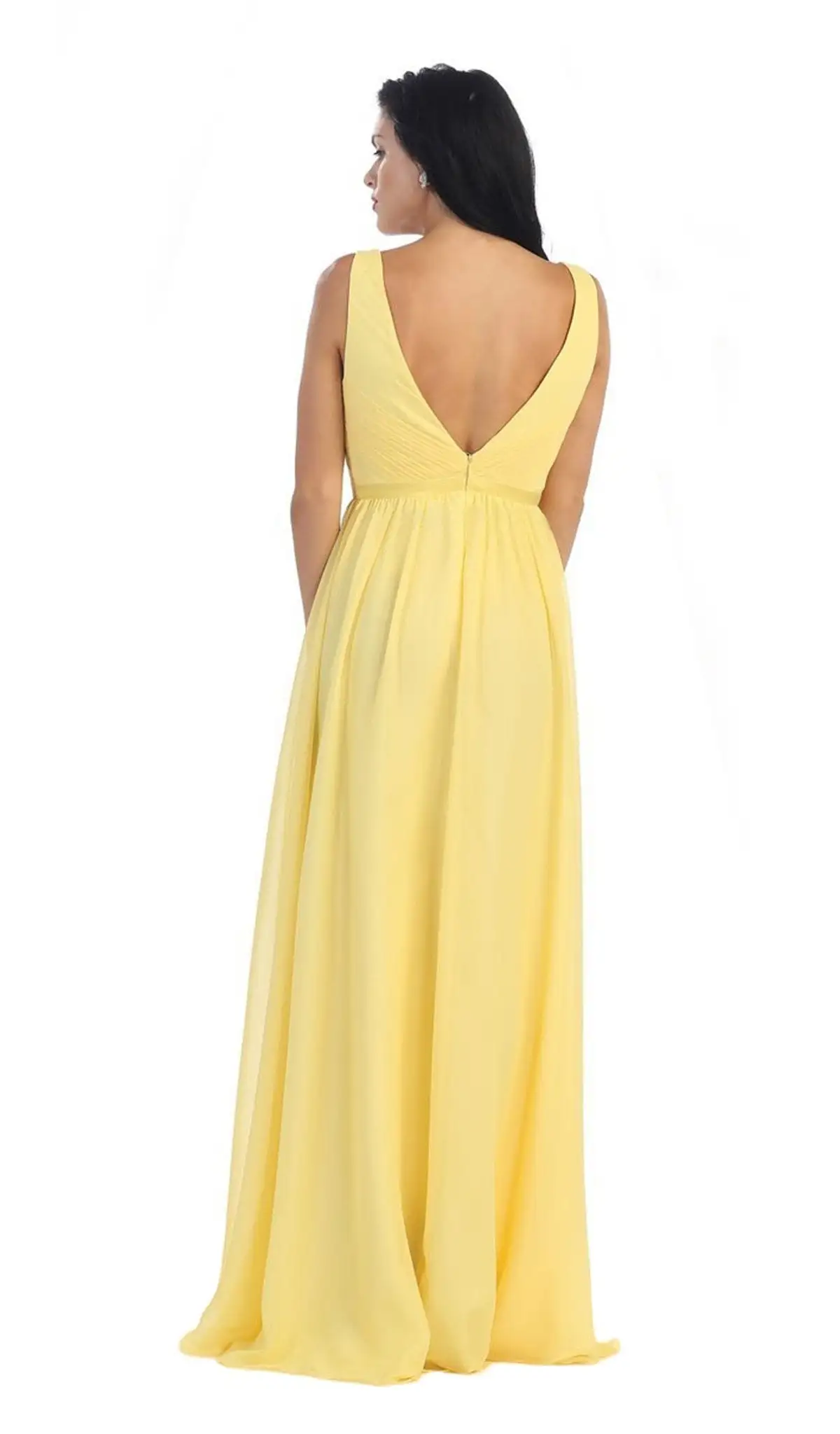 | Details: | Sleeveless, Ruched Bodice, Plunging Notch, Satin Waistband, V-Cut Open Back, Back Zipper Closure, Full Length Hem |