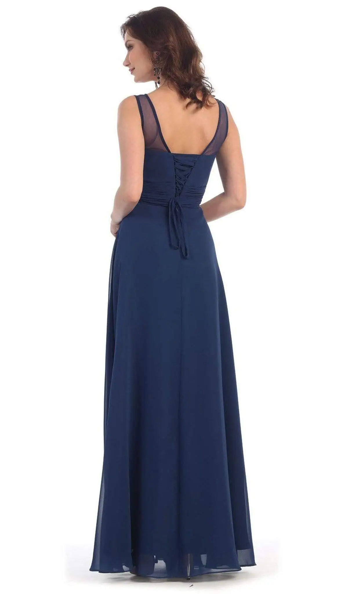 | Details: | Ruched Crisscrossed Bodice, Lace Up Closure, Illusion Open Back, Full-Length Hem |