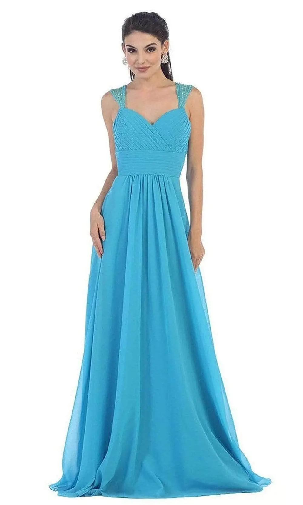 Sizzle and shine with this glamorous May Queen MQ1275 special occasion dress. Featuring sheer embellished straps framing the sweetheart neckline, this lovely piece showcases a pleated bodice, a v-shaped open back and a chiffon A-line skirt. Look flawlessly enchanting in this dazzling long dress by May Queen. Moedls are wearing Turquoise and Yellow colors.