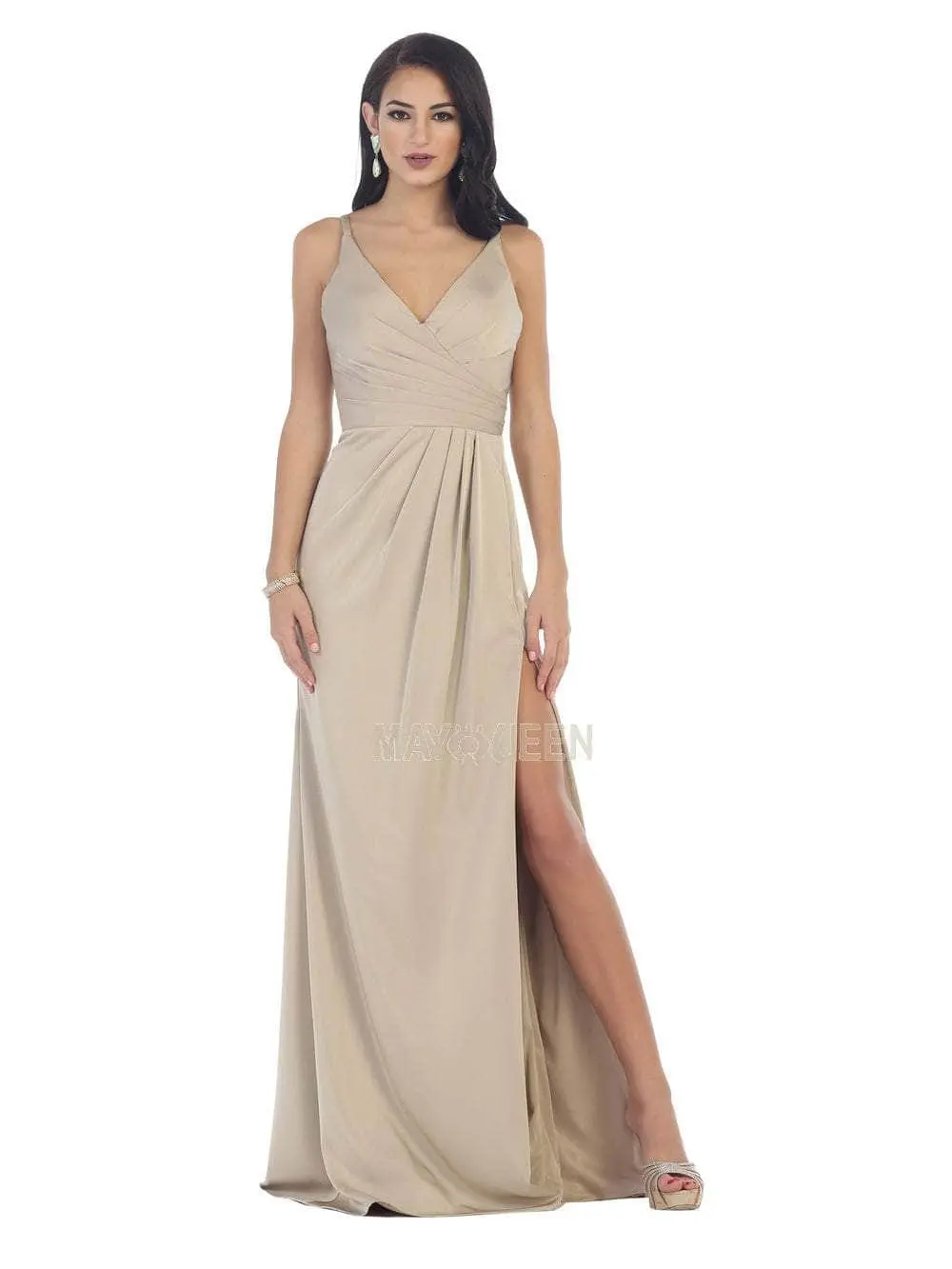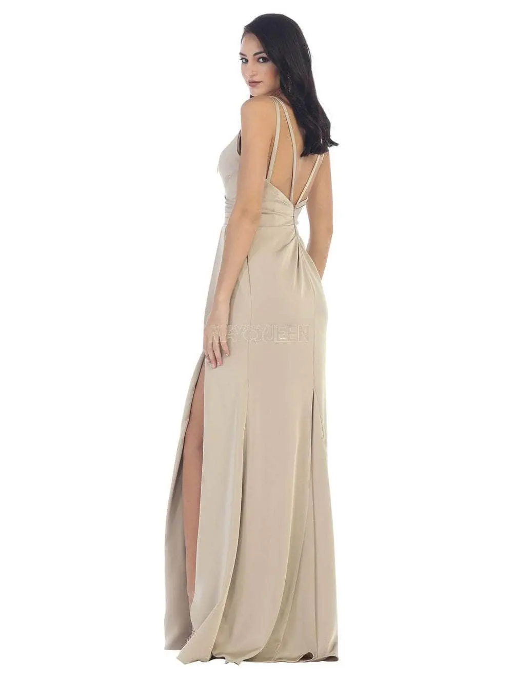 Be the delight of everyone’s eyes in this sophisticated May Queen MQ1469 creation. Flaunting tapering pleats along the sleeveless bodice, this stunner showcases a v-neckline supported with slender straps. Dual straps split at the back to weld the alluring ruched mid-open back. This stylish long dress is made of chiffon material with a high front slit. Be splendidly captivating s you grace every party in this May Queen masterpiece.