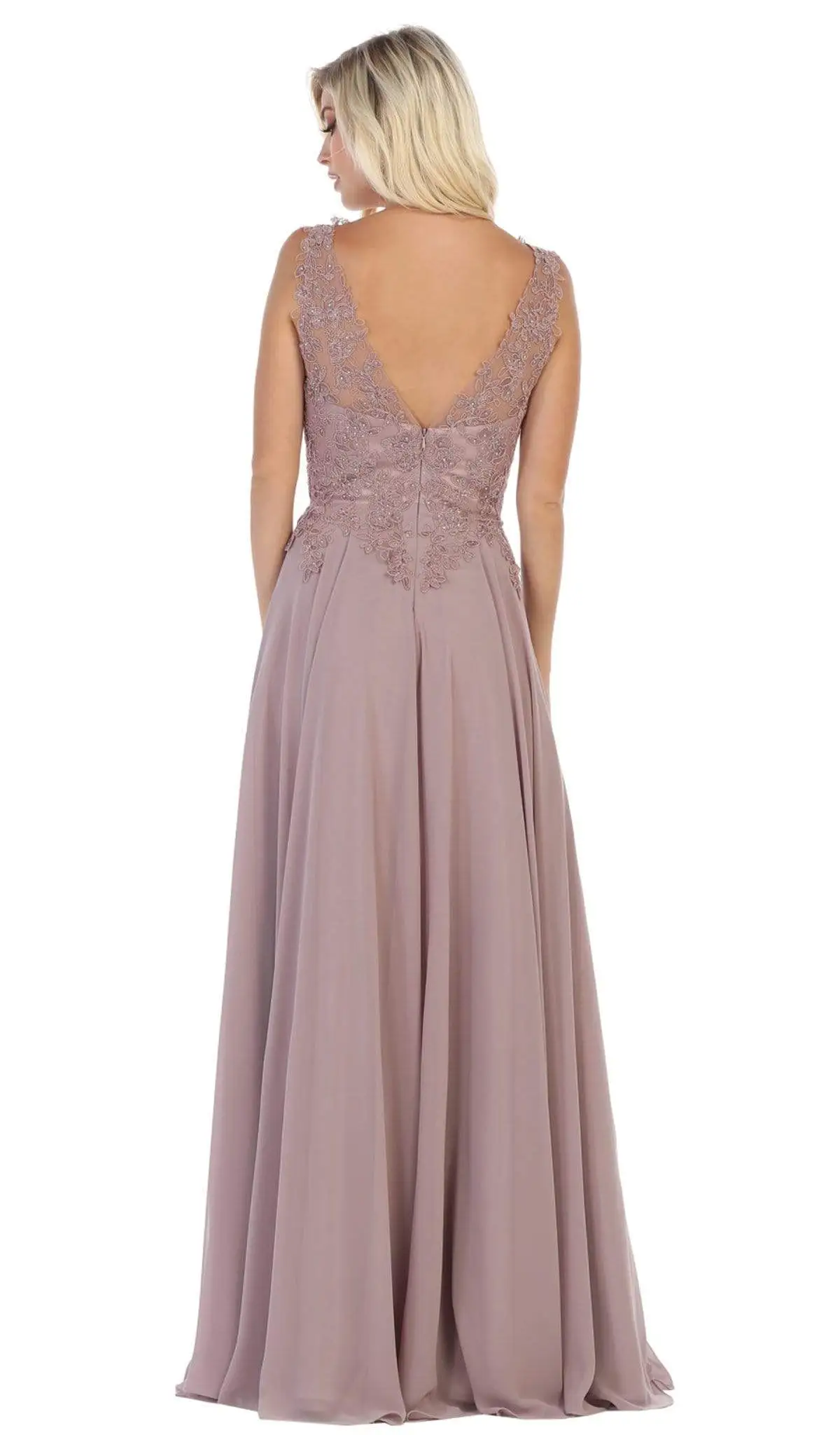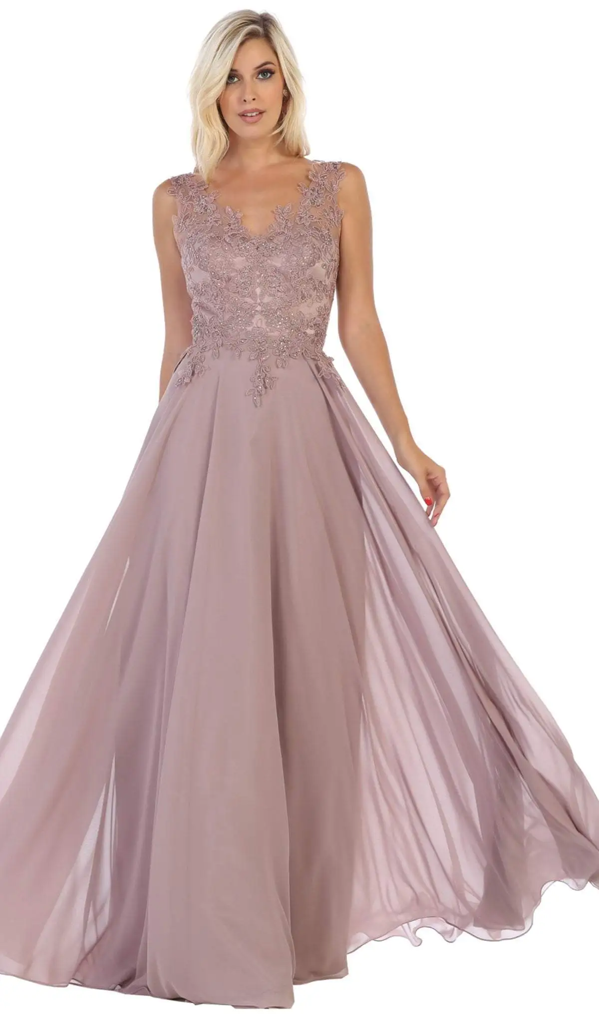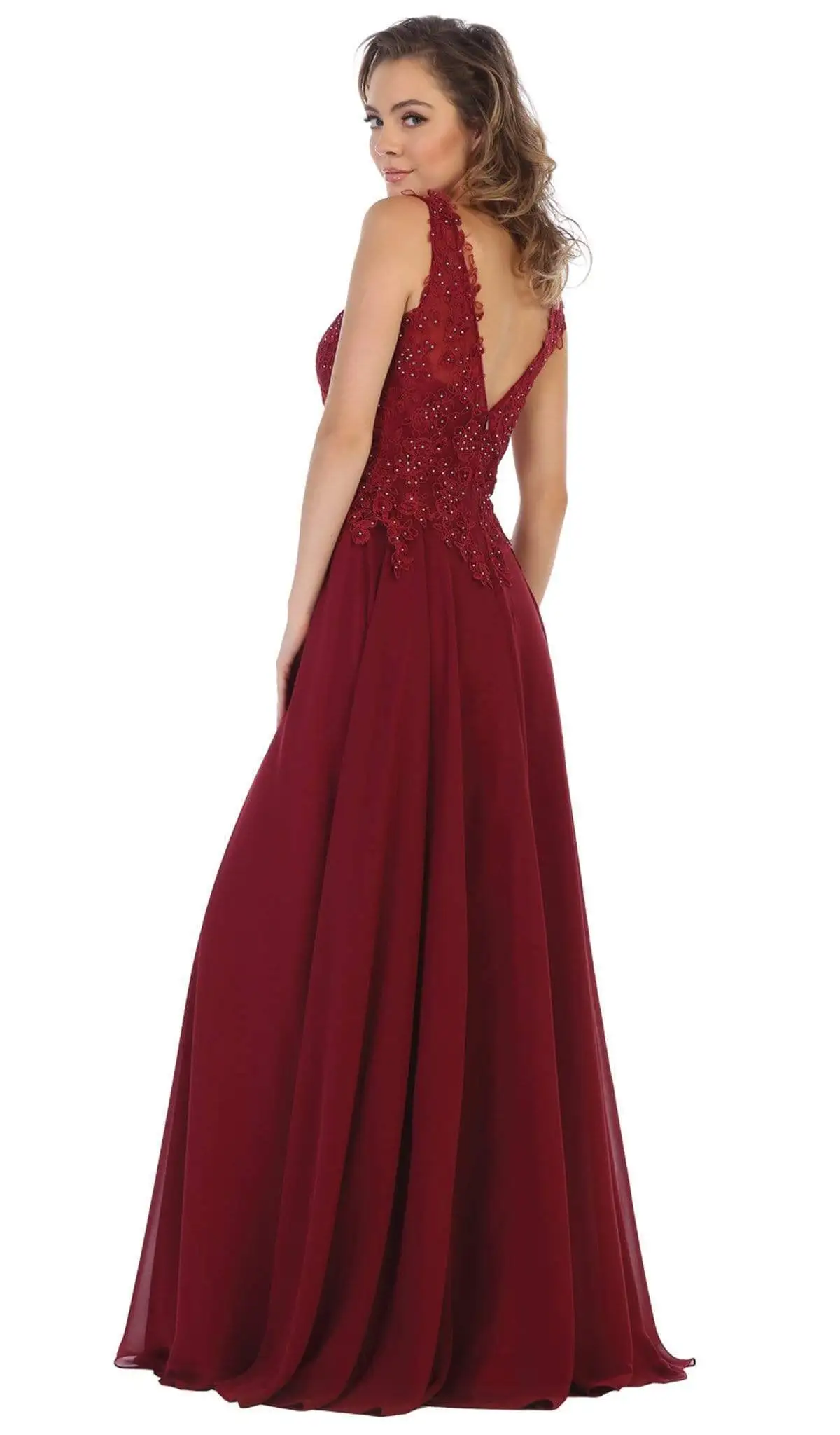 Embrace a wonderful evening in this wondrous formal gown by May Queen MQ1610. This floral applique dress parades in a V-neckline and a V-back. The dress has a zipper closure and from the waist begins a full length skirt in an A-line silhouette. Earn your place in the limelight in this ahh-inspiring evening gown by May Queen.