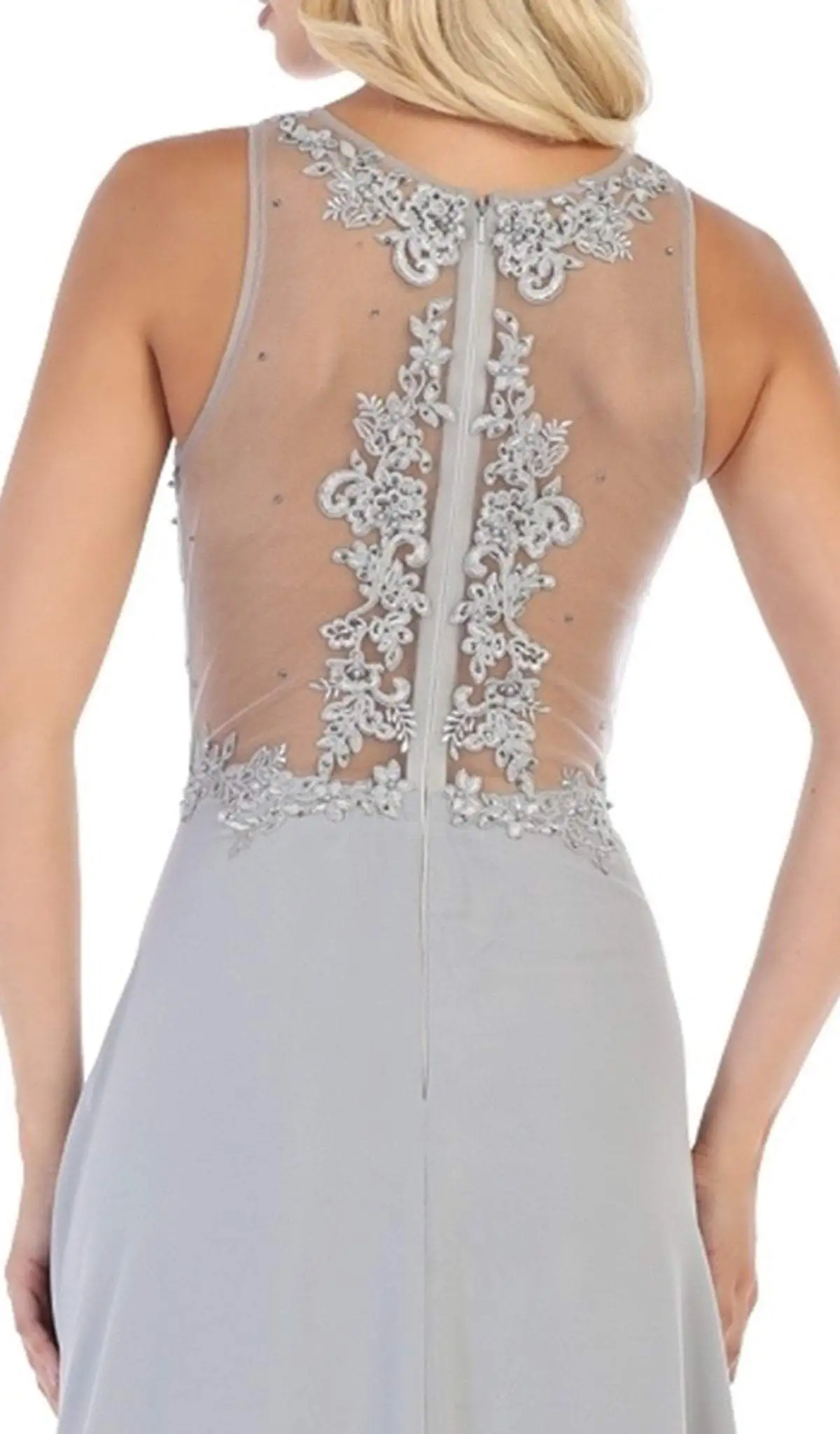 Showcase your brilliant esprit in this Bellissima from May Queen MQ1621. Glams in a sleeveless, illusion jewel neckline with fitted bodice richly ornate with embroidery and stone embellishments. The sheer back has a zipper closure while the A-line skirt runs at full length hem. Look like a siren in a melodic gown from May Queen. Model is wearing Silver color.