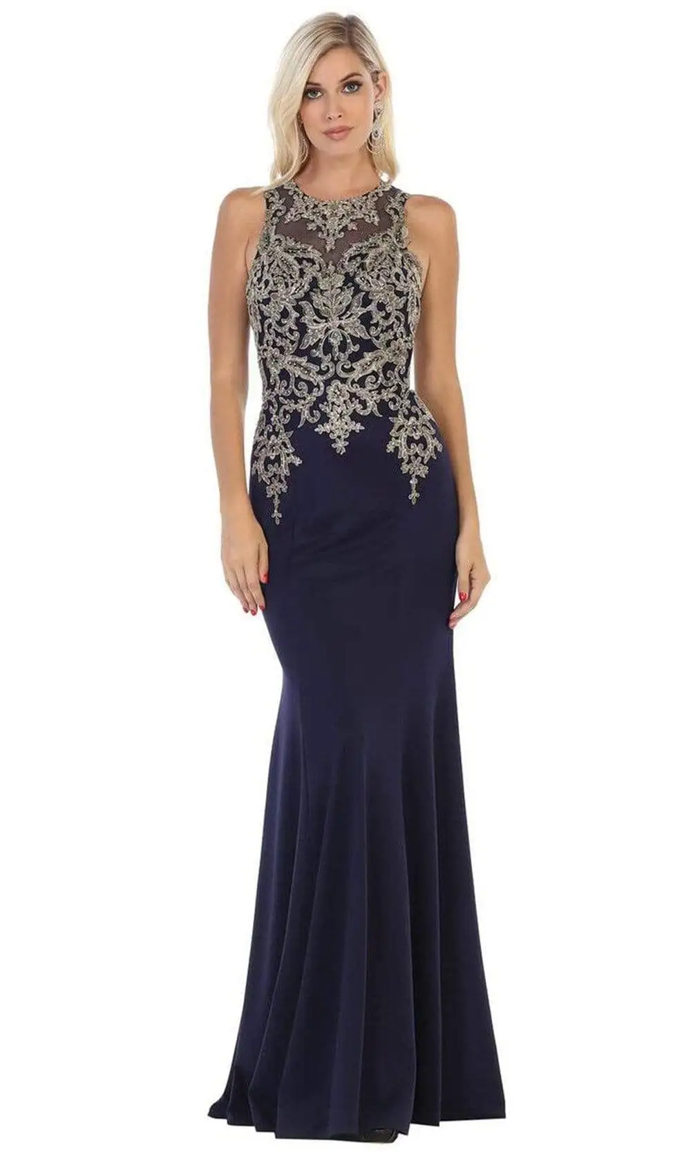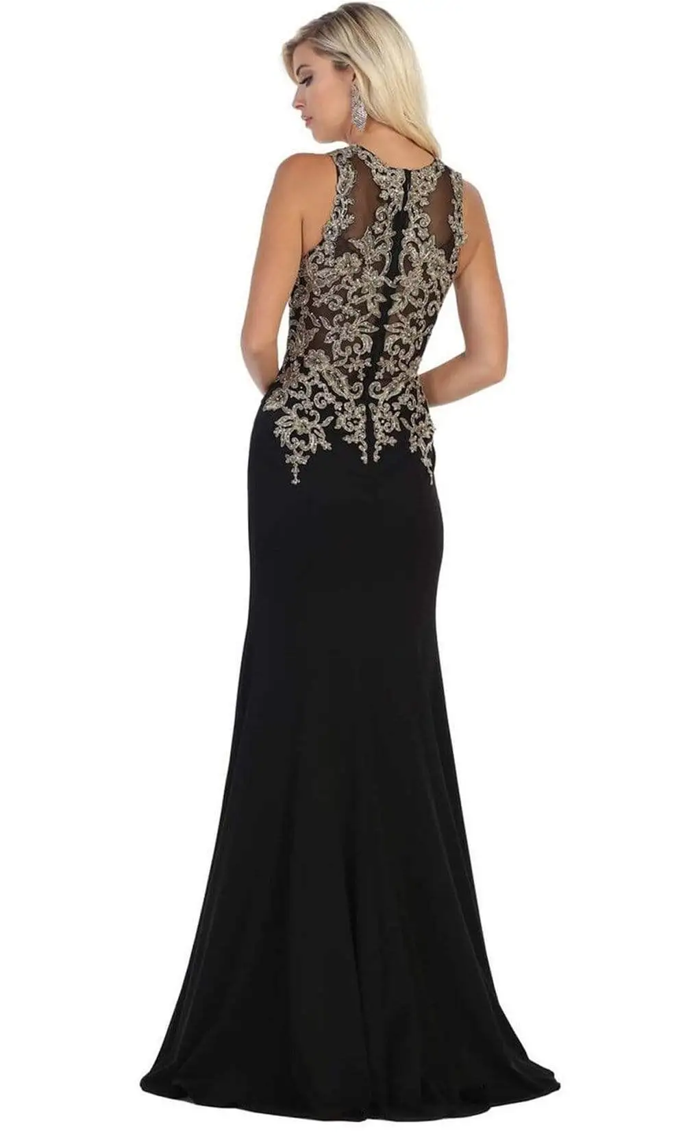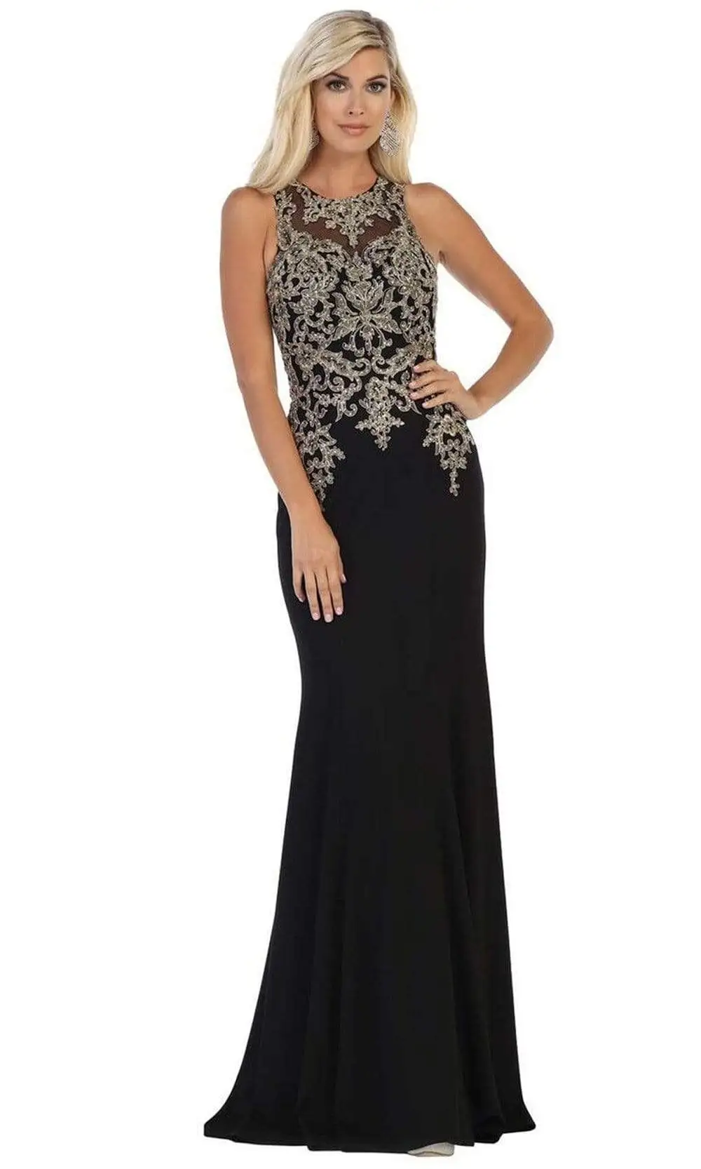 Shine with an opulence like no other in this exceptional May Queen MQ1629 creation. Fashionably crafted with golden lace appliques studded with tiny jewels, this beauty shows an illusion jewel neckline on a sleeveless bodice. Refined with a subtly sheer full back, this ensemble boasts beaming filigree that renders its full-length trumpet silhouette with a train. Glow with poise and sophistication while in this May Queen masterpiece.
