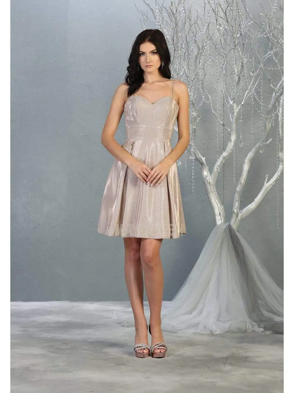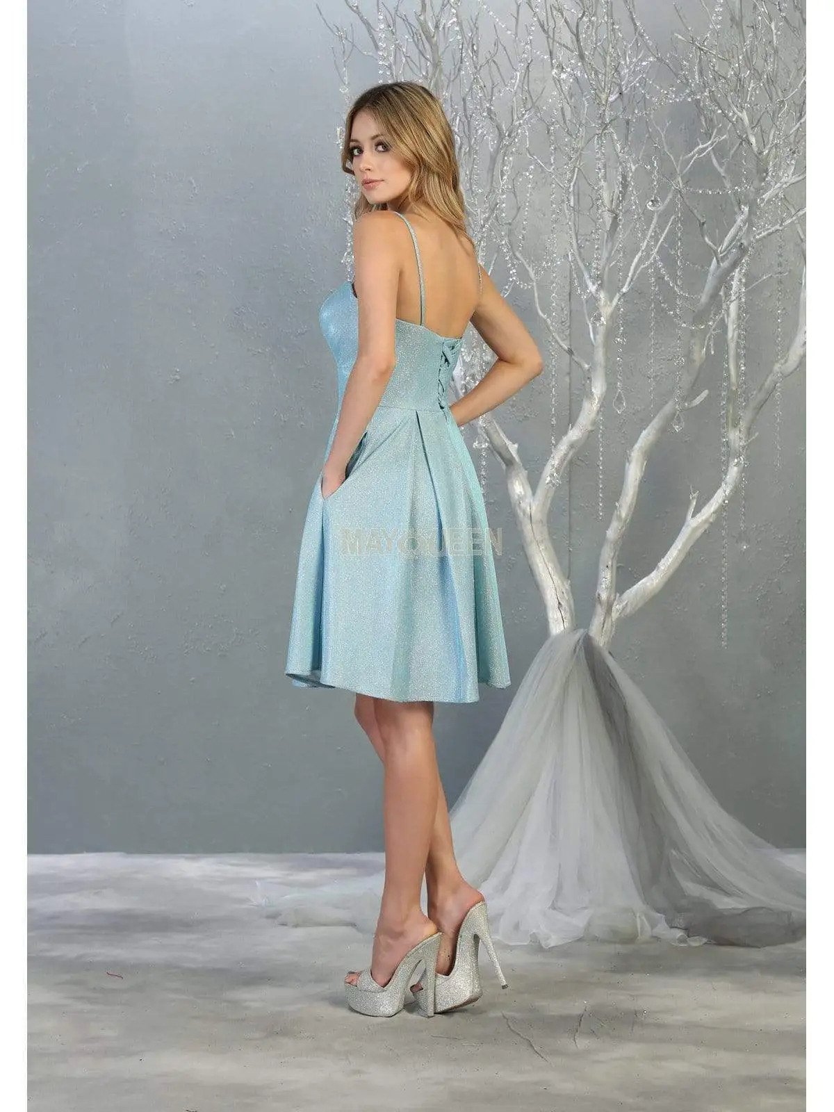 Bask in the chic flair of this May Queen MQ1791 creation. Crafted in a lovely glitter fabric, this dress showcases a sweetheart bodice that is stringed with thin straps. The back is cinched with a corset design. The midriff is nipped with a wide empire band. The softly fluttering A-line skirt ends in a short hemline. Look like a dreamy vision in this stellar May Queen masterpiece.