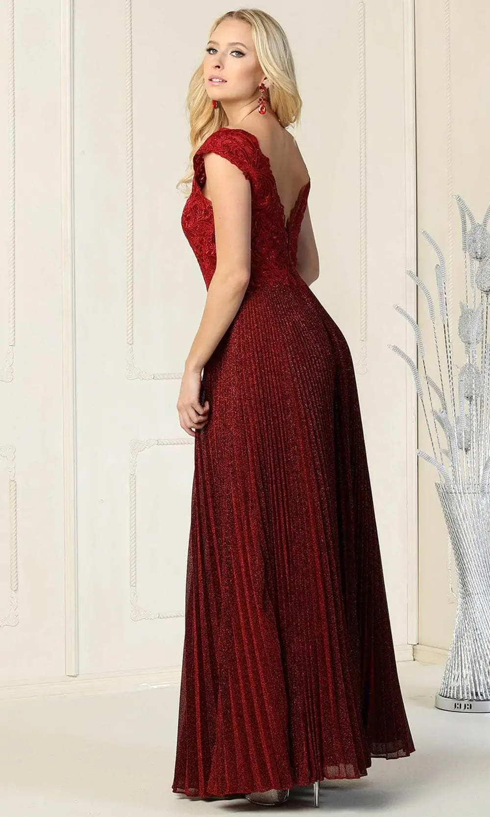Exhibit your impeccable style in this formal gown by May Queen MQ1836B masterpiece. This fitting bodice astonishes with its exquisite lace embroidery. It features a scalloped lace V neckline and sheer lace cap sleeves, both of which are adorning the sleeveless fitted bodice. The skirt features lovely accordion pleating that spans the length of the hem, which is full length. Everyone will fall in love with you as you sparkle and shine in this May Queen masterpiece. Model are wearing Burgundy, and Rosegold colors.