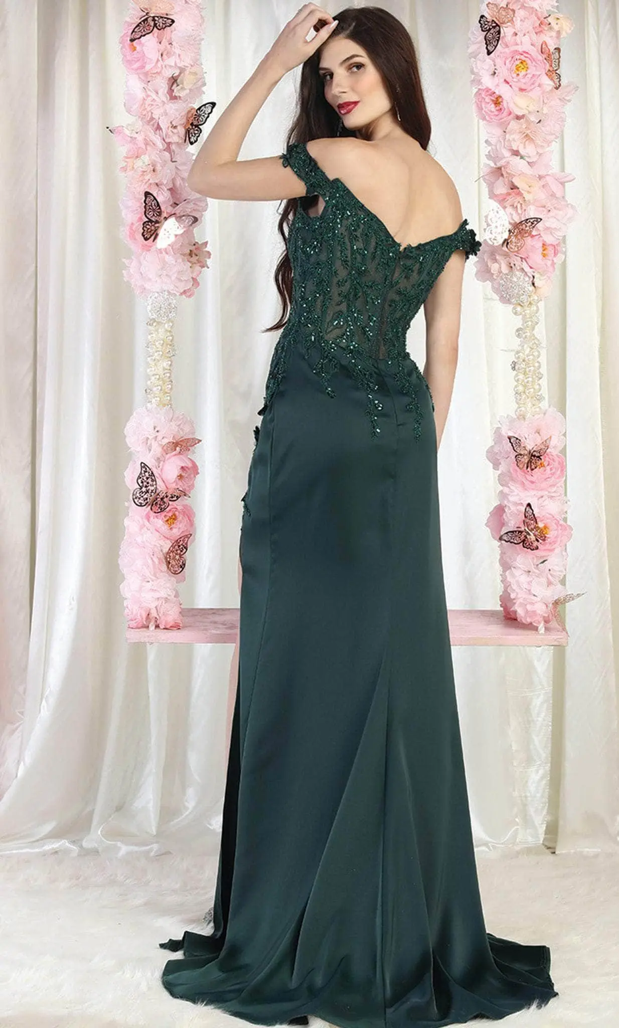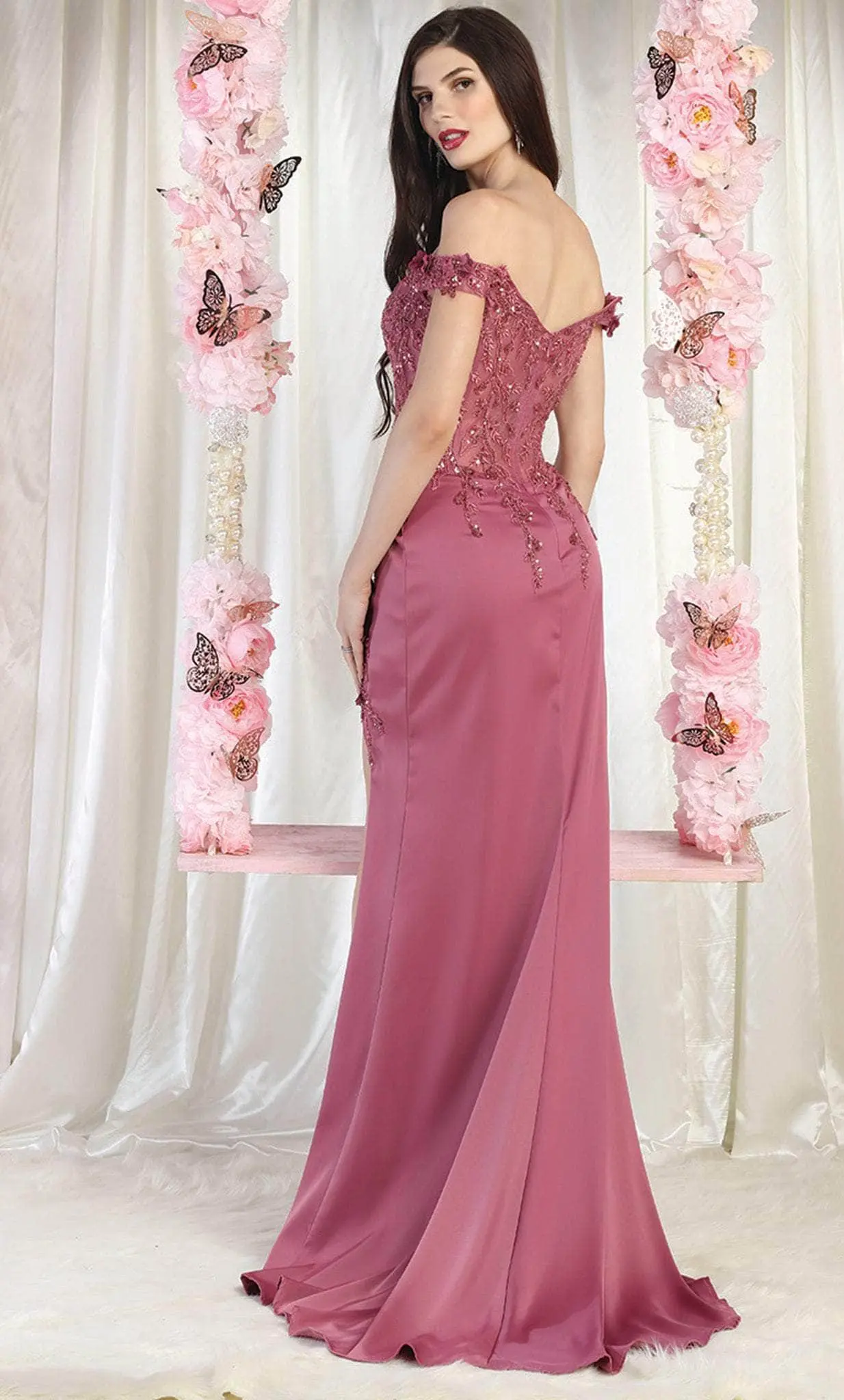 Exhibit an exceptional style in this superb May Queen MQ1962 creation. This beautiful dress features an off-shoulder v-neckline and sheer corset boning bodice festooned with 3D floral applique and beaded lace. The back shows some skin with its mid-open cut design and has a center zipper closure. Revealing a thigh-high slit adorned with the same embellishment, the skirt creates a sheath silhouette that gracefully streams in a full length hem and sweeping train. You are a breath of fresh air in this dreamy May Queen MQ1962 evening dress. Models are wearing the Black, Champagne, Hunter Green, Lipstick and Mauve colors.