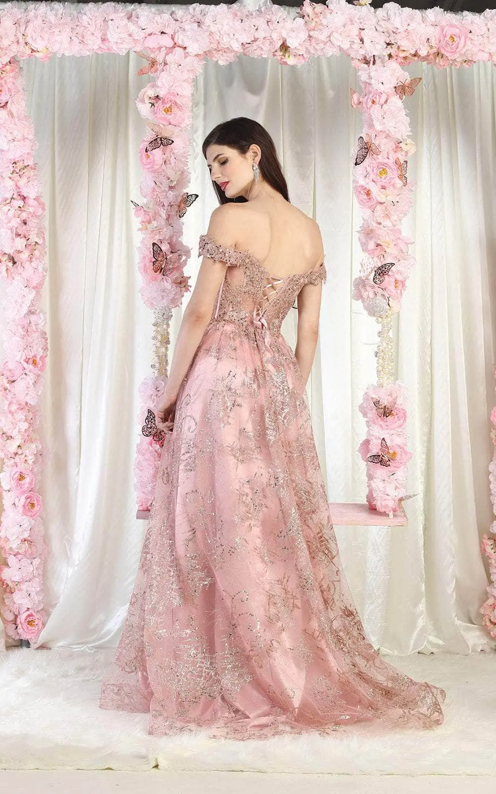 Capture that striking presence and get everyones attention in yhis May Queen MQ1975 gown! Your grand entrance cannot be missed with a dramatic flourish of this dazzling A-line gown. It opens with off shoulder sleeves and a plunging neckline, while the bodice appears like crystals glued to skin in a breathtaking masterpiece of beadwork and rhinestones The lush skirt features satin and a sheer glittering overlay plus a high front sit. A sure winner from May Queen MQ1975 ! Model is wearing Rosegold color.