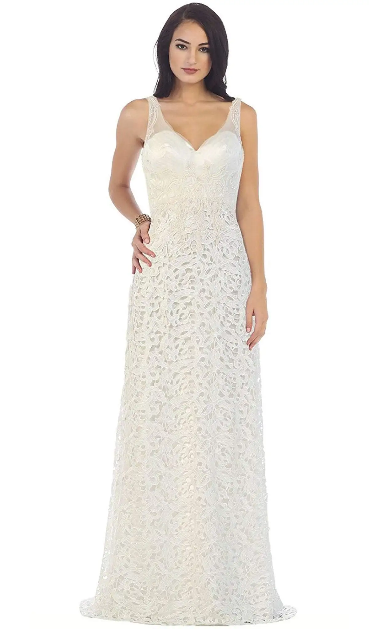 Get ready for everyone to stop and stare when you show up in this long ensemble by May Queen RQ7470. The dress flaunts a sleeveless, V-neckline with sheer straps supporting the sweetheart lined bodice. The dress is styled with sparkling embellishments and lace appliques cascading to the sheath skirt with mini train. The back shows a V-cut and a zipper closure. Be in this gorgeous May Queen creation and leave a lasting impression.