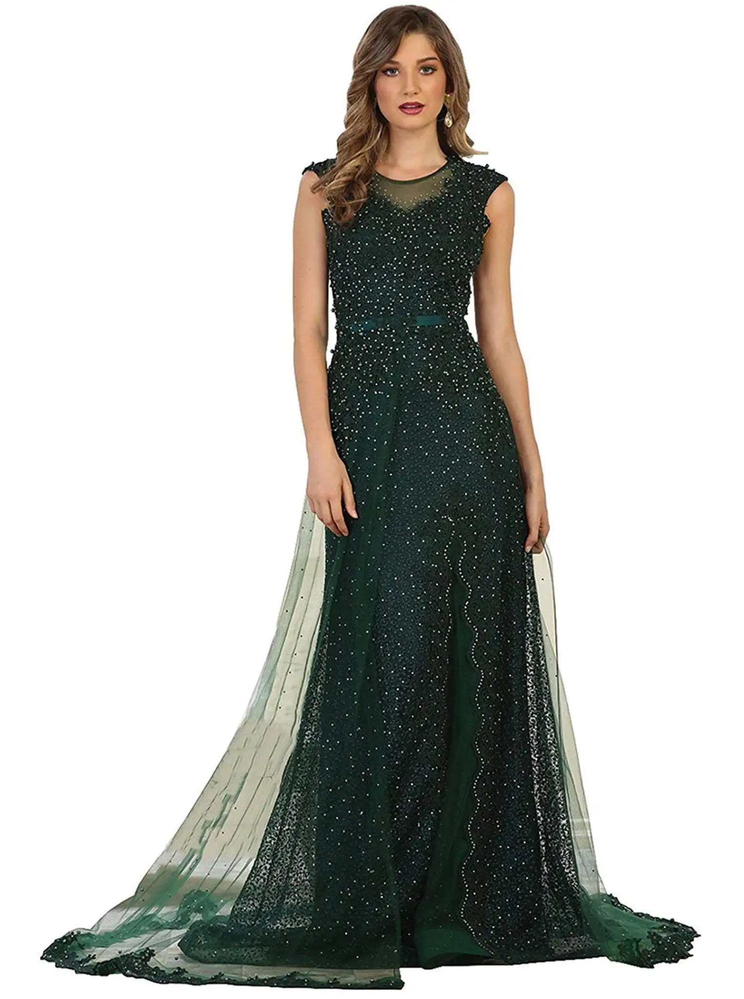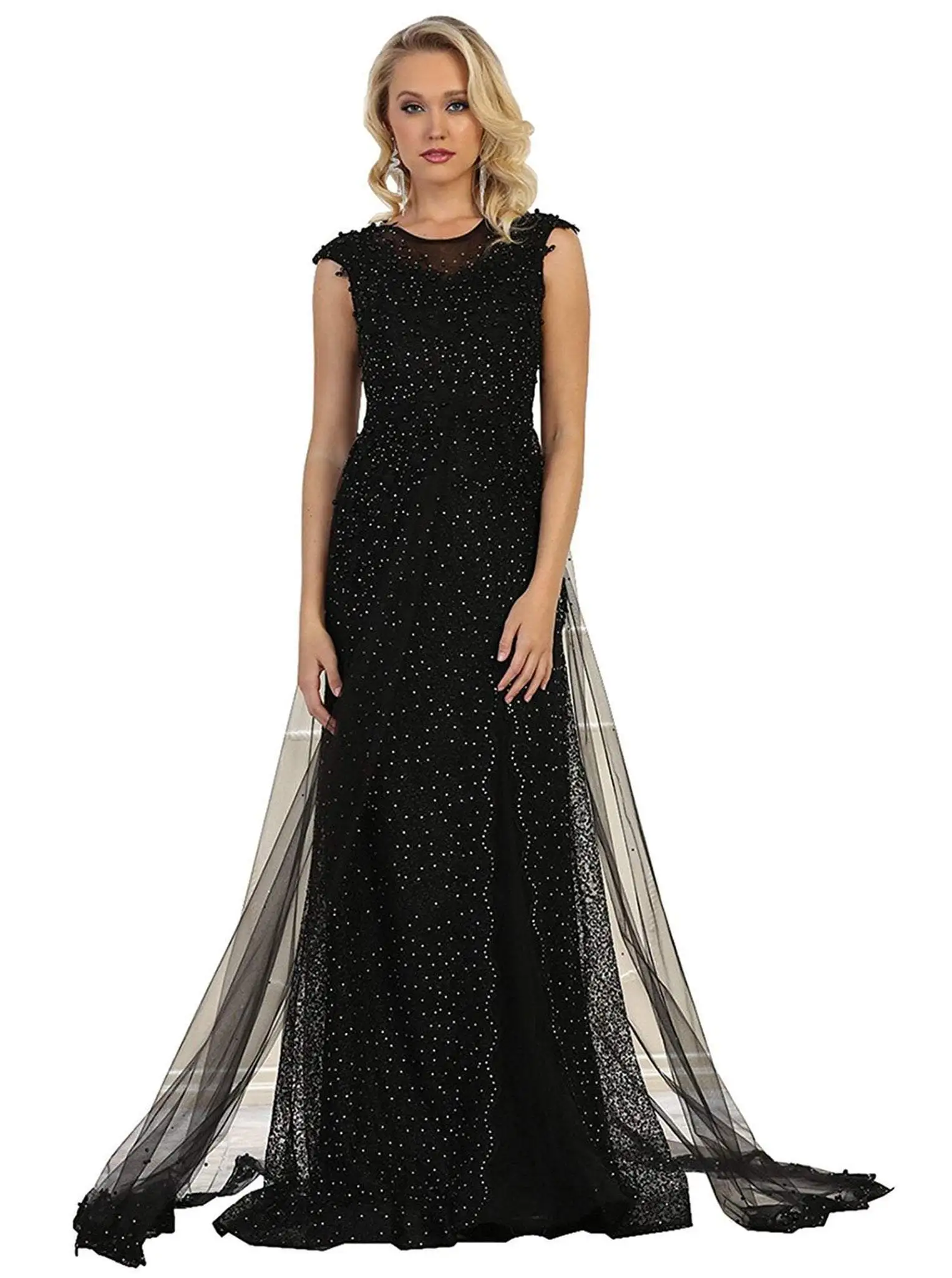 Make it a moment to shine in this gown by May Queen RQ7556. Charms in an illusion jewel neckline with cap sleeves. The form fitting bodice is extravagantly decked with sparkling embellishments that continue to the floor length skirt with sweep train. Get noticed in this radiant May Queen piece.