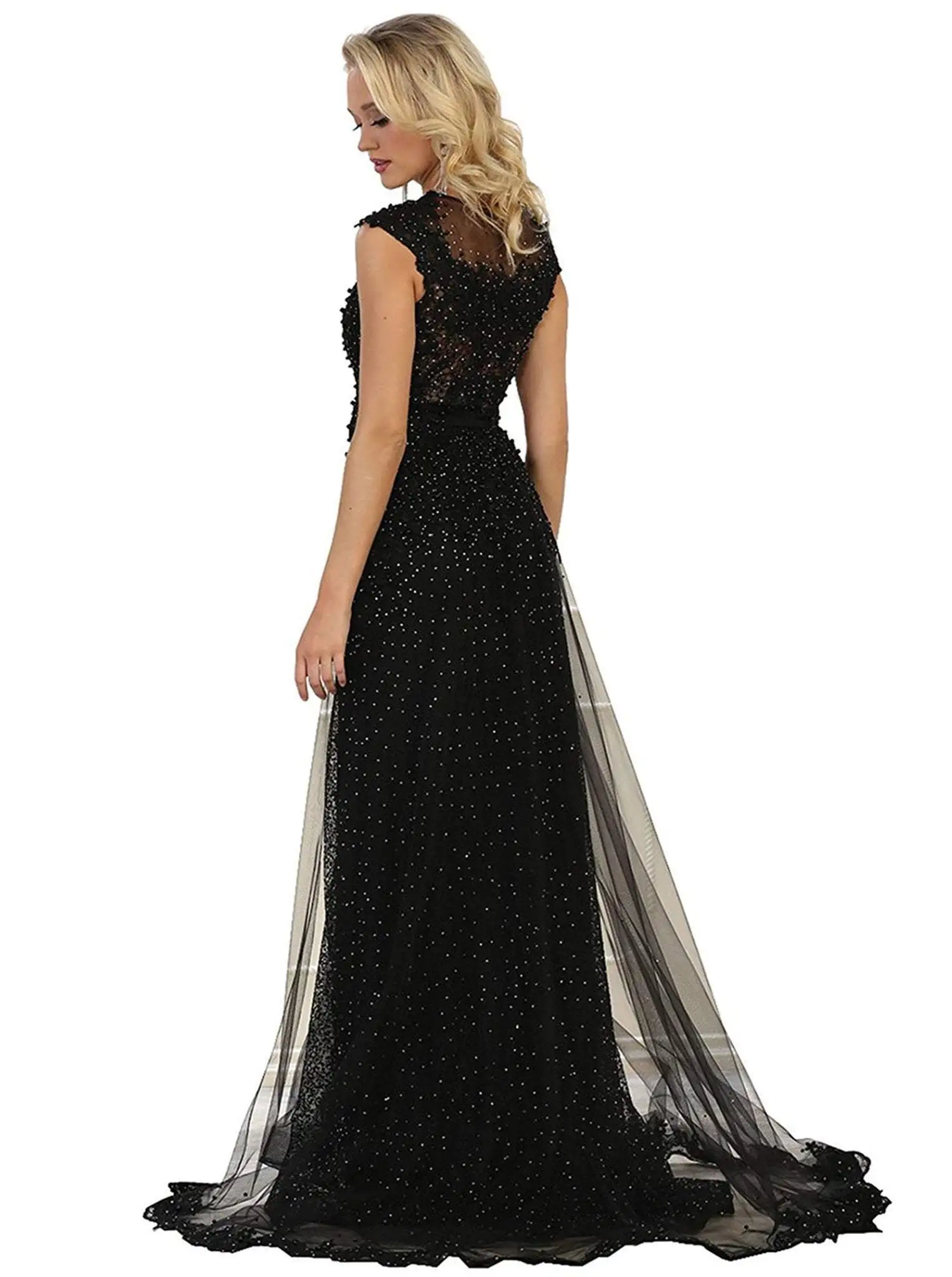 | Details: | Cap sleeves, Sheer fabric, Embellishments, Fitted bodice, Sheath skirt, Sweep train |
