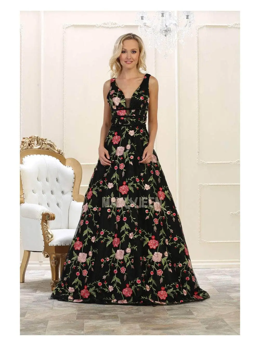 Gather appreciative stares while you are in this alluring creation by May Queen RQ7618. This breathtaking gown features exquisite tailoring on a floral print fabric, featuring the vibrant english rose pattern to its full length. Accentuated by triple beaded waistband sitting from your empire waist to your natural, while the back flaunts an open-style with a zipper closure. The sweep train finish of the skirt shows an A-line silhouette, as it is fully lined for your comfort. You are sure to be the life of the event as you are wearing this dazzling May Queen floral dress. Model is wearing Black/Multi color.
