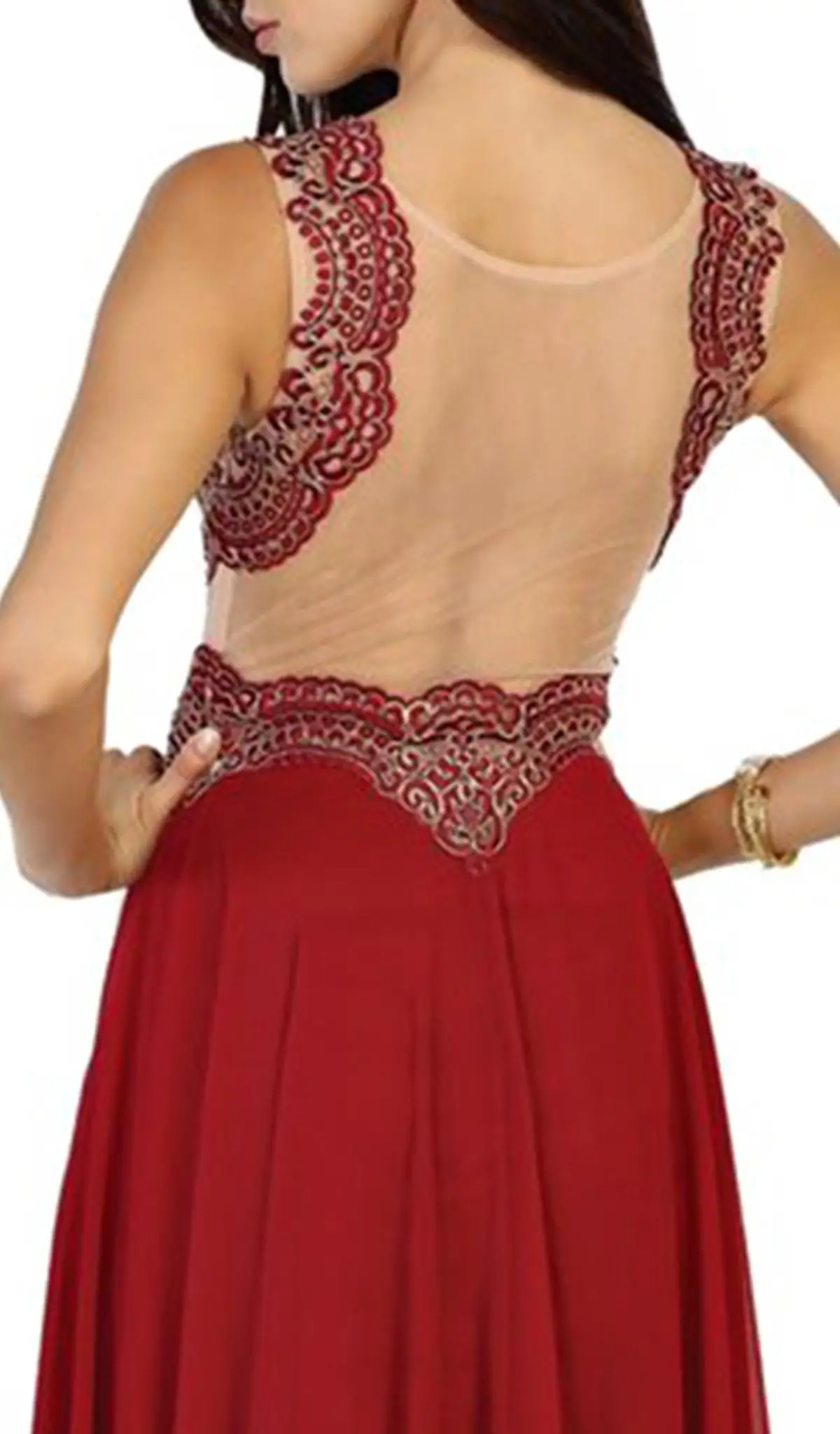 Look impressively gorgeous at your much-awaited prodigious event in this intricately aggrandized May Queen MQ1487 creation Beautifully sheathes in scalloped trims and a spectacle of metallic lace fabric, this alluring piece features a scalloped v-neckline with a sheer scalloped midriff on a sleeveless bodice. Festooned with elaborate ornaments on a Basque-styled back, this exquisite piece also presents scalloped lace details on an illusion fabric. With a blend of shirred pleats and curvilinear trims embracing the natural waist, the A-line skirt cascades magnificently down to complete at a full-length hem and a sweep of train. Radiate impeccable taste and decadent style in this gorgeous May Queen masterpiece. Model is wearing the Burgundy and Mauve colors.