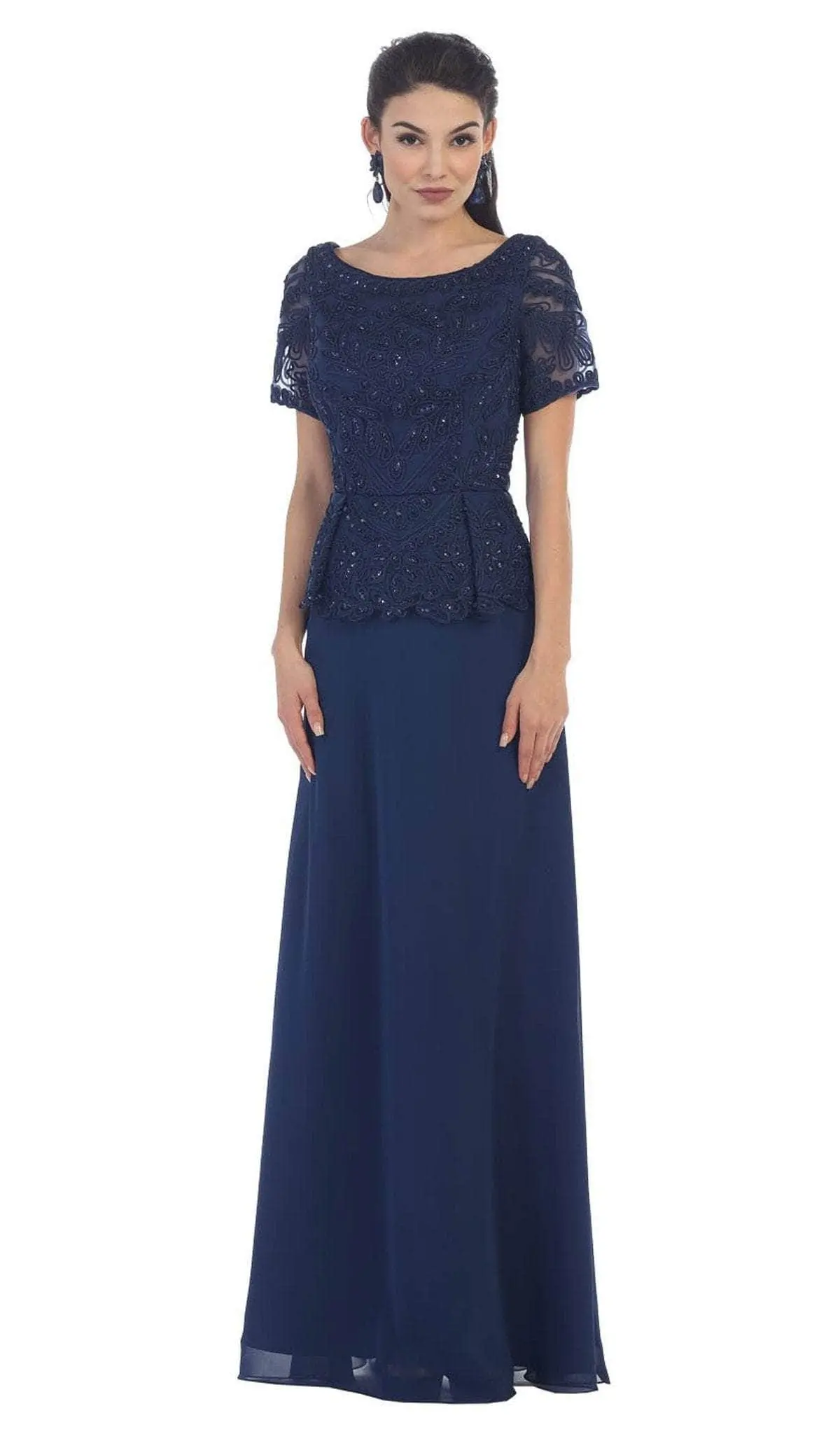 Look and feel like a million bucks in this chic May Queen MQ-1427 creation. This dress features short sleeves and a bateau neckline with a peplum detailed bodice embellished with piping and accents. The skirt runs in full length hem. Inspire everyone to give you that second look in this stunning May Queen masterpiece. Model is wearing the Navy color.