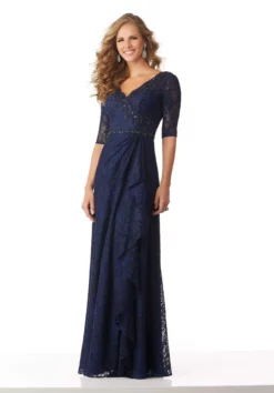Fall in love when you slip on this gorgeous MGNY By Mori Lee 71809 dress. This stellar piece showcases a beaded surplice bodice framed with a V neckline and lace half sleeves. A beaded waistband tops the faux wrap A-line skirt, accented with side-front draping detail for added volume. The back flaunts a V cut, secured with a center zipper closure. Step out in a beautiful gown from MGNY By Mori Lee creation. Model is wearing Navy color.