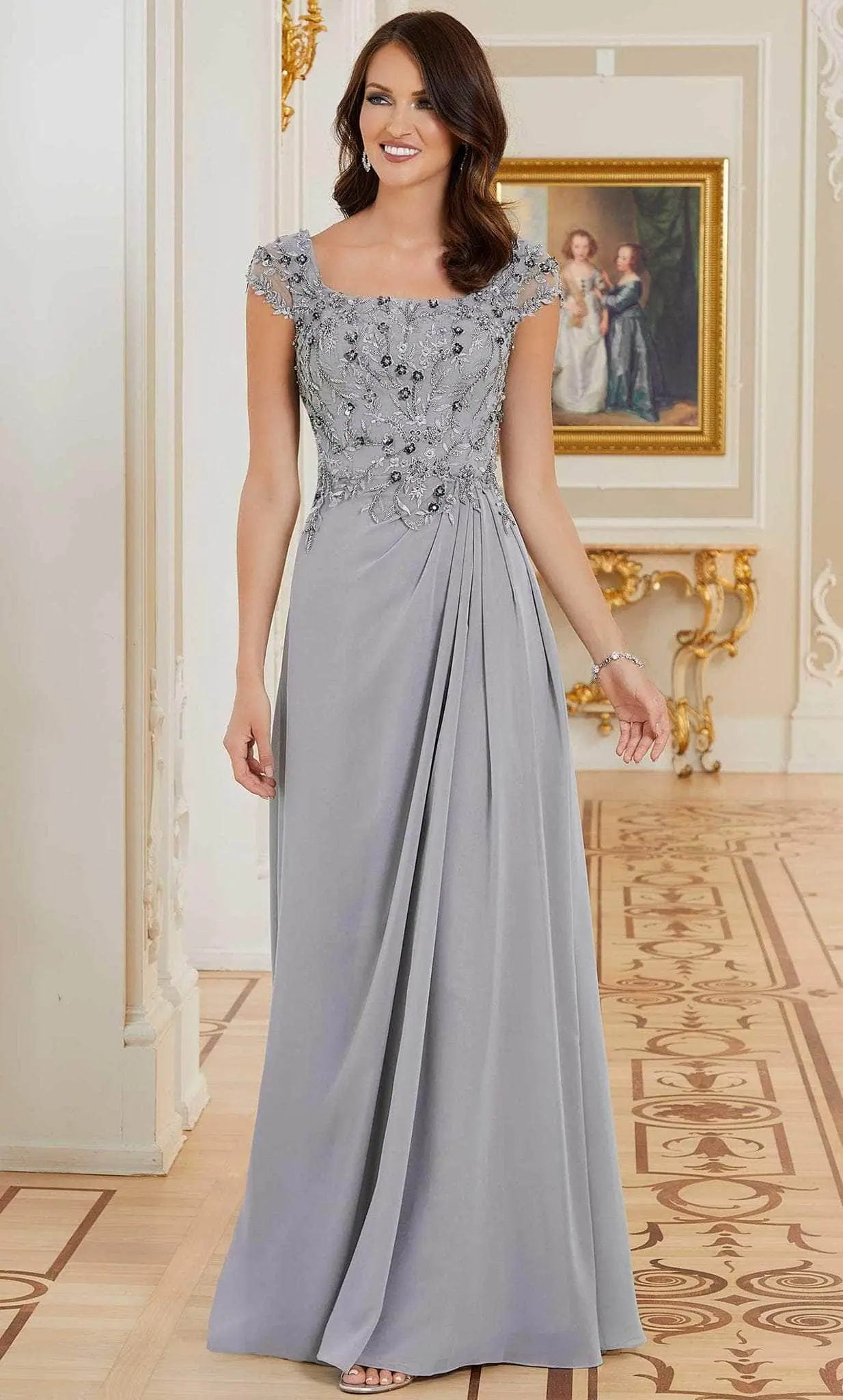 Charm everyone with the fascinating beauty in this Mori Lee 72704 creation. This stunning evening gown has a trendy square neckline and sheer short sleeves on a bodice that is decorated with delicate crystal beaded, flower embroidered appliqués. The back of the gown is adorned with floral embroidery too. The A-line silhouette of the draped chiffon skirt is quite flattering on you. A coordinating shawl is supplied. Astound everyone by the sheer romance of this Mori Lee 72704 masterpiece. Models are wearing Silver, and Slate colors.