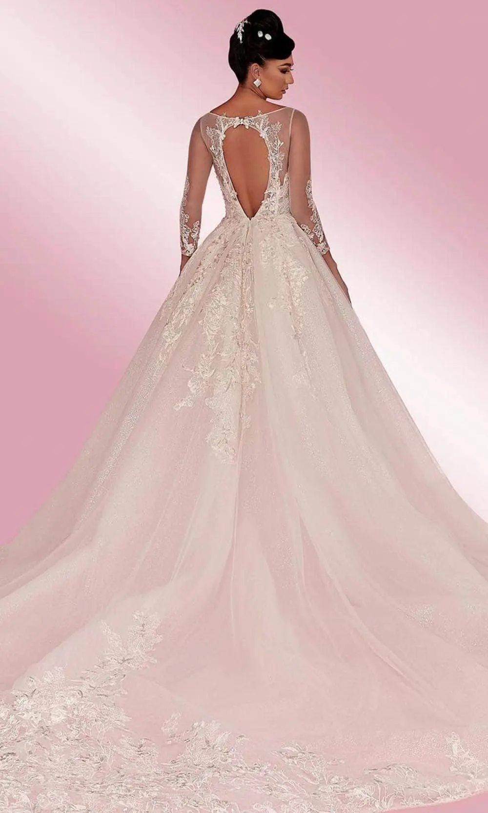 Bloom with loveliness in this dazzling lace applique a-line dress from MNM Couture. Show off your classy style by wearing this a-line dress that has an illusion neckline and a sheer long sleeve with high-quality lace applique details and an open-back that will still keep you modest as you walk down the aisle. Give it a shot and be the spotlight, fantasize night like Cinderella by wearing this extravagant dress. Model is wearing Off White