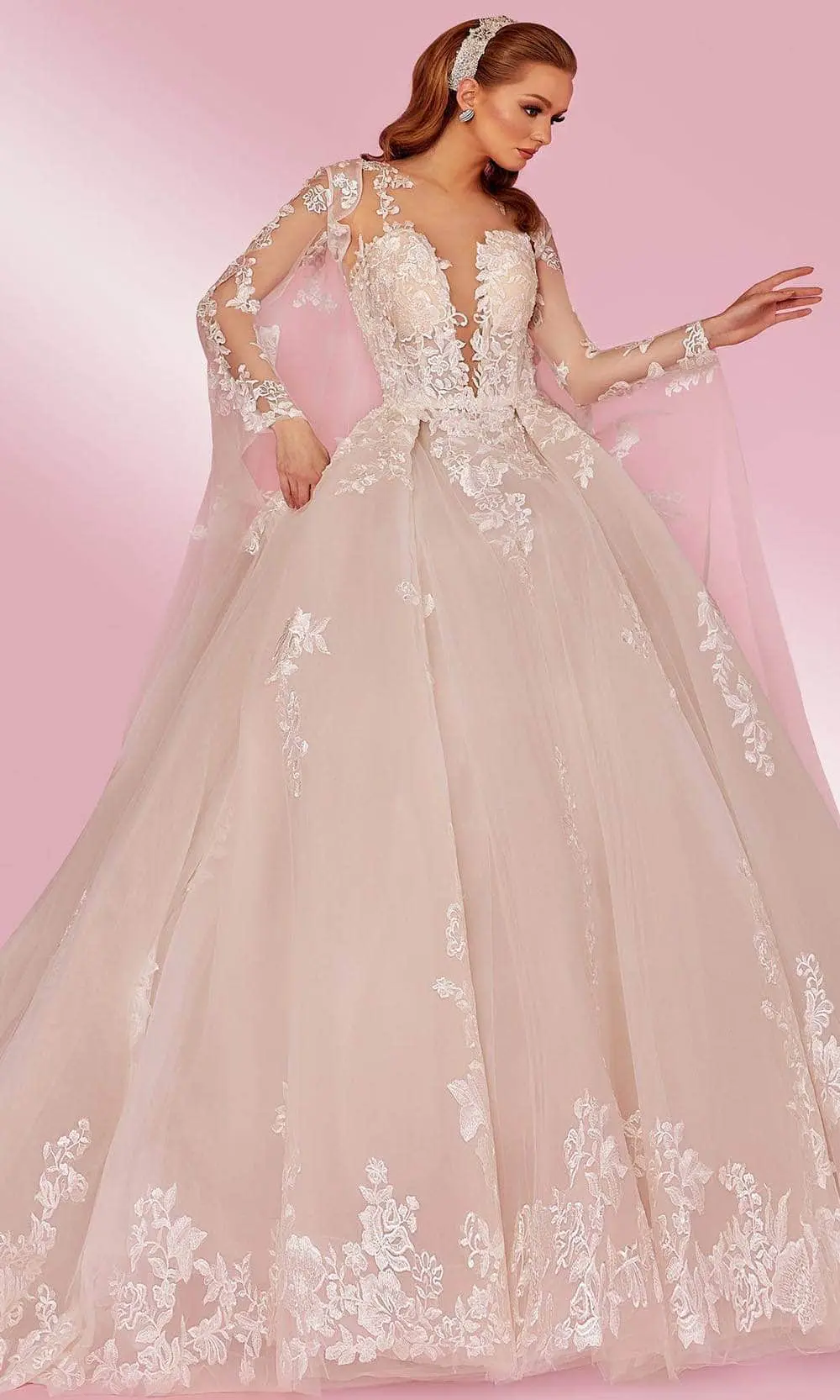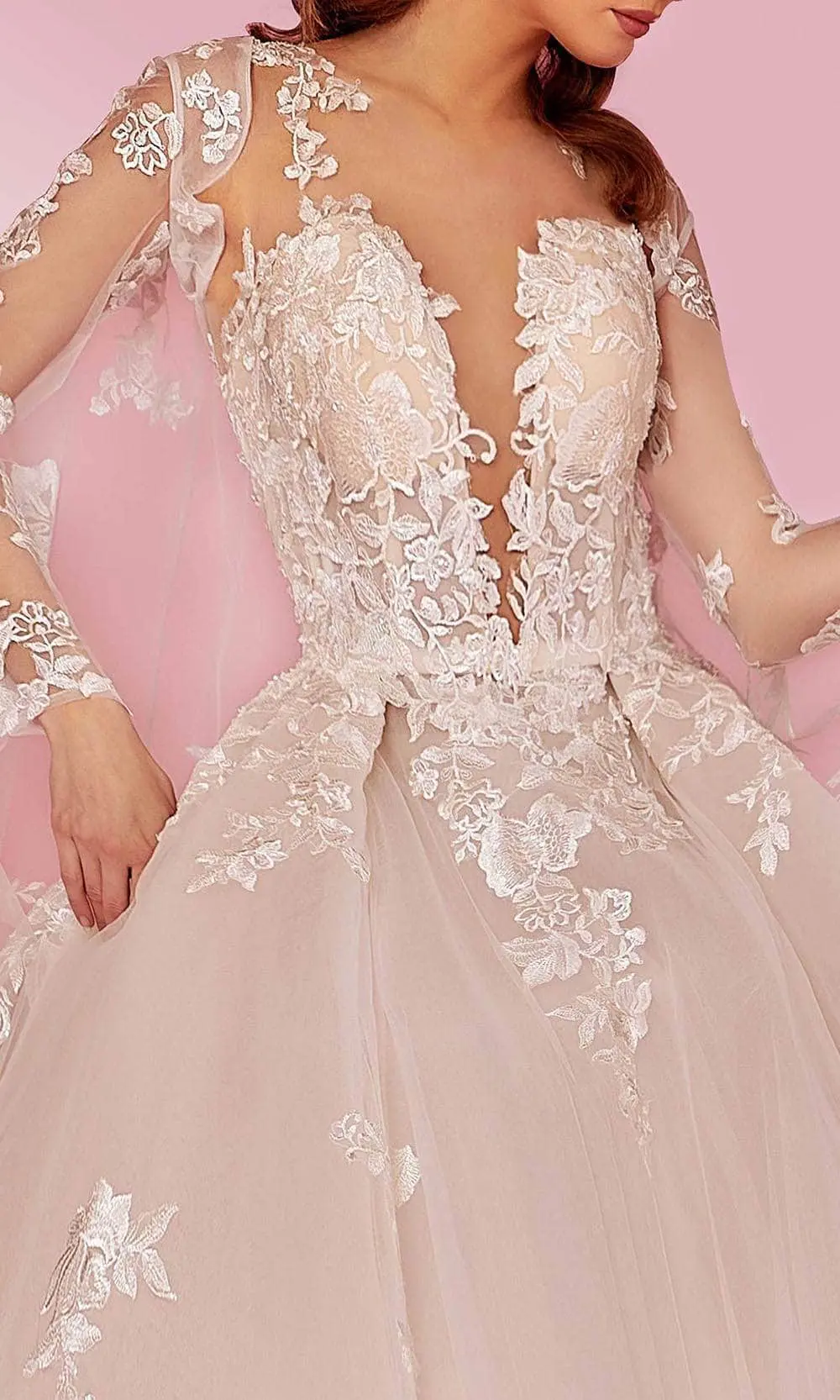 | Details: | Deep V Neck, Detachable Cape Sleeves, Lace appliques, Ball gown |