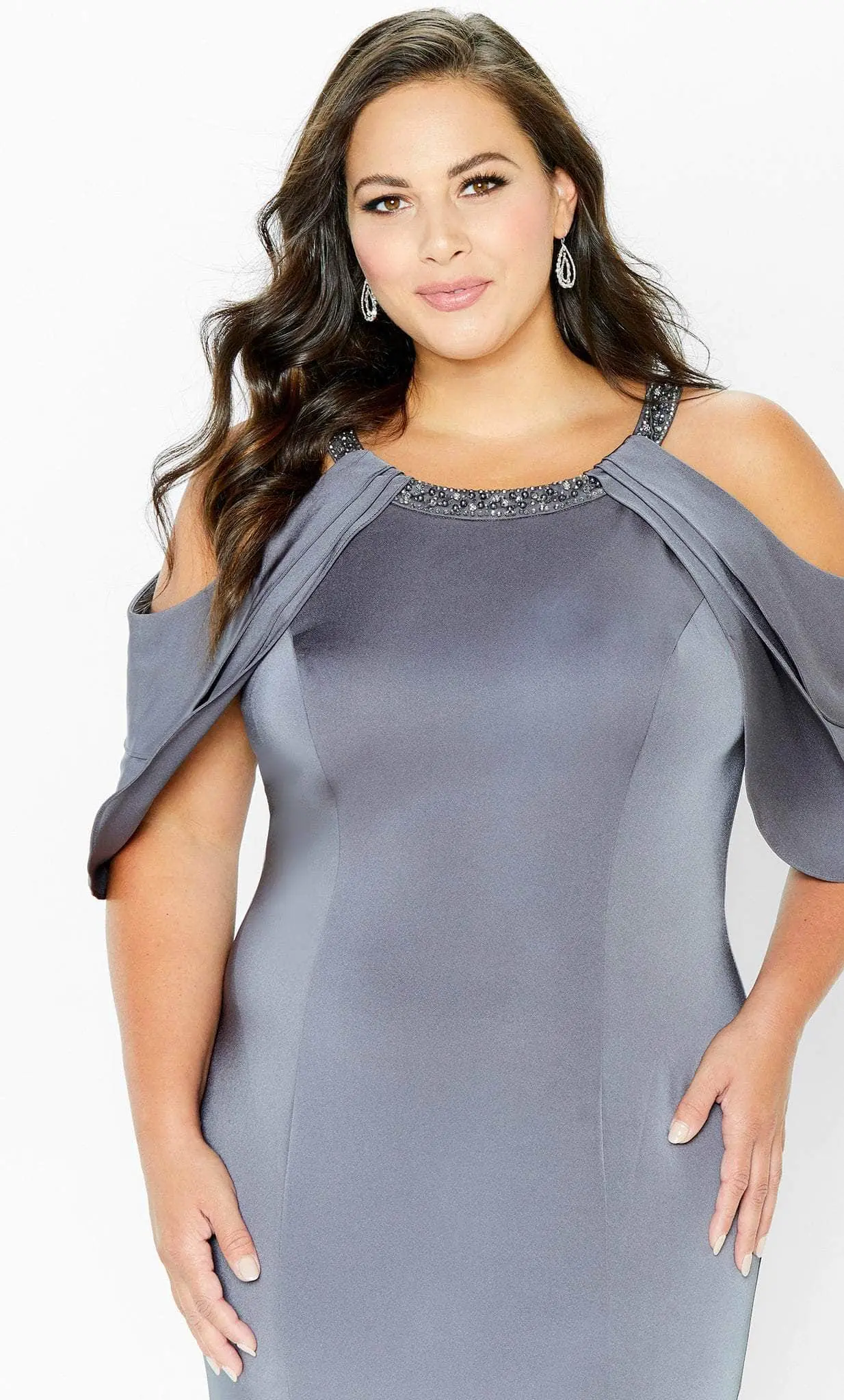 Be the spectacular belle at your next formal event in Montage by Mon Cheri 120906W. The scoop neckline on this crepe gown is embellished with beads. Reveals cold shoulders that have tiered sleeves that make this winning piece look more elegant. The skirt that falls beautifully to the floor has a trumpet silhouette and ends with a sweep train. Walk in glamour and let all heads turn on you in this creation by Montage by Mon Cheri 120906W. Models are wearing Charcoal and English Rose colors.