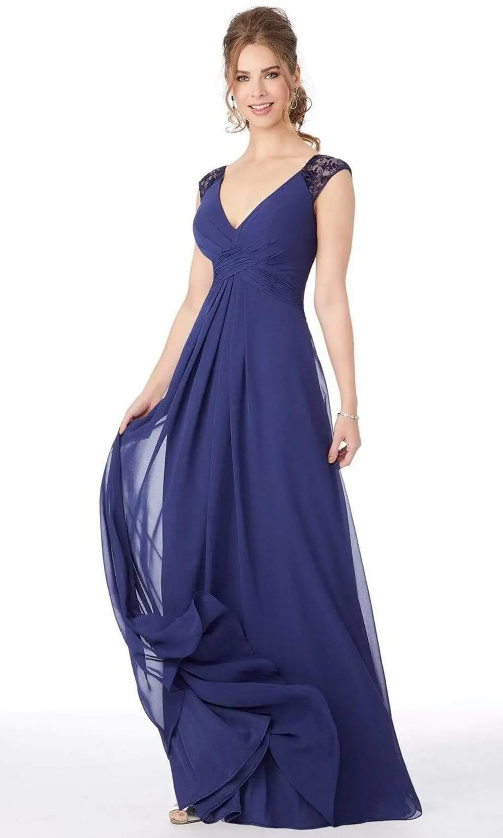 You are more than gorgeous in this Mori Lee 21687 bridesmaid dress. This chiffon dress showcases a draped waist detail and embroidered cap sleeves with keyhole back. The skirt reveals an A-line silhouette which finishes to a full length hemline. Be dressed up beautifully in this Mori Lee dress. Model is wearing Sapphire color. More colors available. Please call our sales team at 855-700-4239.