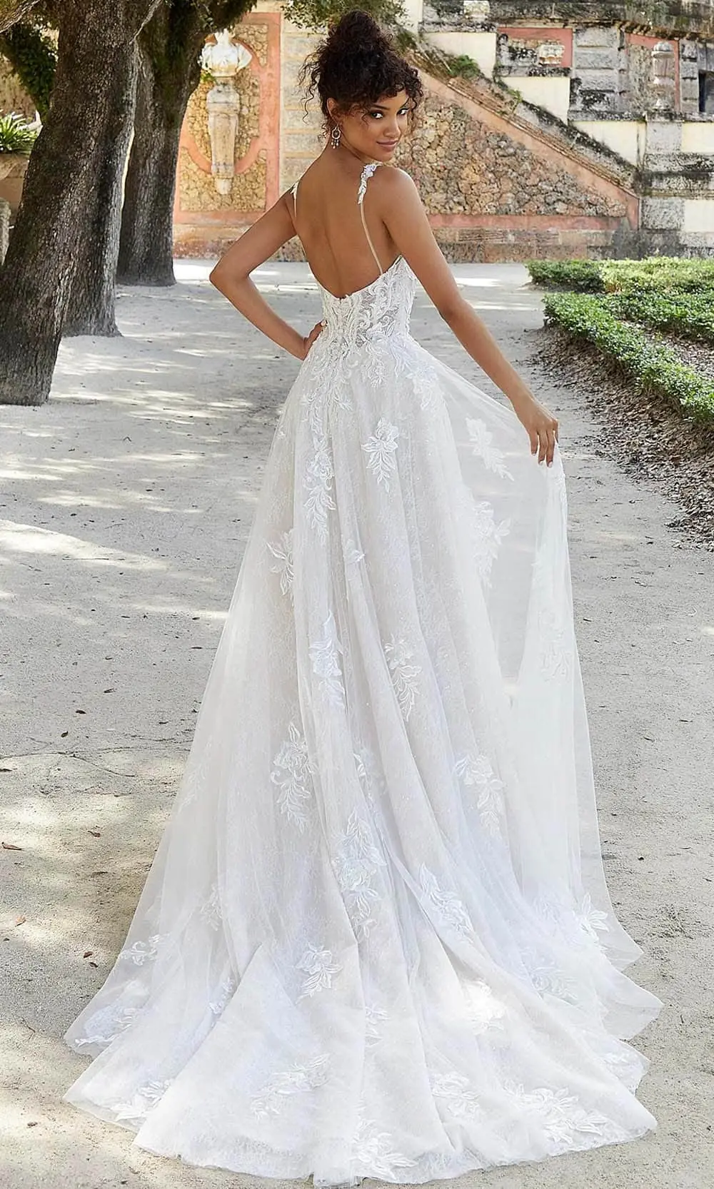 In this wedding dress from Mori Lee Bridal 2479, get ready to stun everyone. On your wedding day, you’ll feel beautiful and romantic in an A-line wedding dress with a Chantilly lace silhouette. The V-neck corset bodice features exquisite lace appliqués made of crystal beads. A delicate and elegant touch is added by the thin appliquéd straps that connect to the open back with button fastening. Everyone will stop and look in amazement as you go down the aisle in this stunning wedding dress from Mori Lee Bridal. Model is wearing Ivory/Latte/Honey.