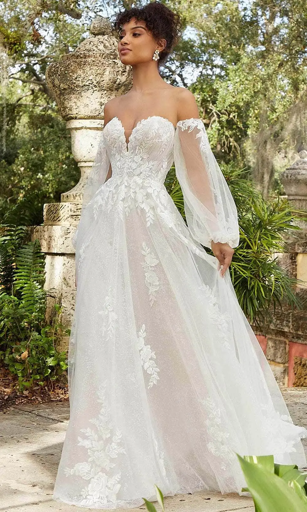 Flatter your figure with this eccentric design by Mori Lee Bridal 2480. a sophisticated gown made from tulle fabric with a sweetheart neckline and strapless bodice adorned with embroidered lace appliques. The detachable bishop’s long sleeves were a perfect match. The skirt has an A-line silhouette and a sweep train at the back. Commence a new chapter of your journey to forever in this fascinating Mori Lee Bridal creation. There are three lengths available: 55 inches, 58 inches, and 61 inches model is wearing Ivory/Champagne/Honey color.