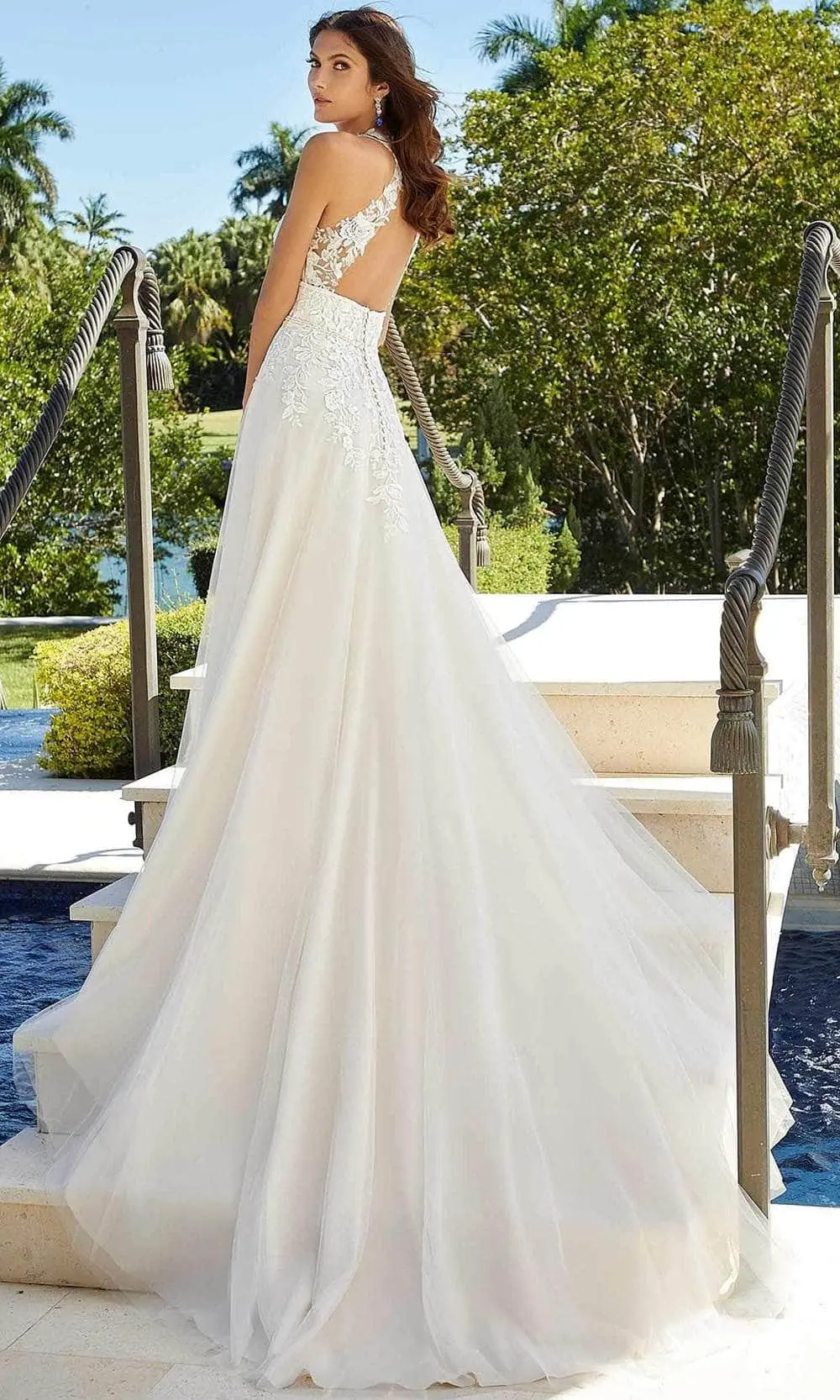 This Fiona wedding dress by Mori Lee 5979 evokes the spirit of timeless romance that so many modern brides desire for their wedding day. Features an embroidered lace on a frosted floral pattern, the bodice flaunts a deep V-neckline supported by beaded waistband on an empire waist, and an open back accented by sheer lace straps. The skirt flourishes in an A-line silhouette, with cotton buttons at the back, which is classic and stylish, as it cascades to a dramatic chapel train. Make their jaws drop when you walk down the aisle in this Mori Lee Bridal creation. Model is wearing Ivory/Champagne/Honey.
