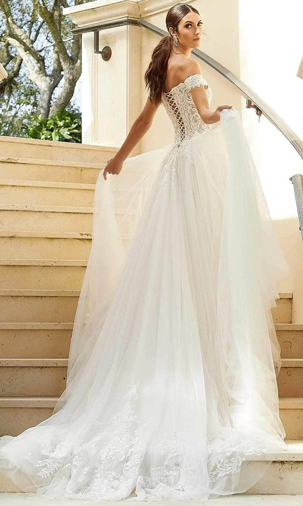 | Details: | Off-shoulder sleeves, Lace, Sheer, Corset boning, Mid-open back, Lace up tie, Chapel train |