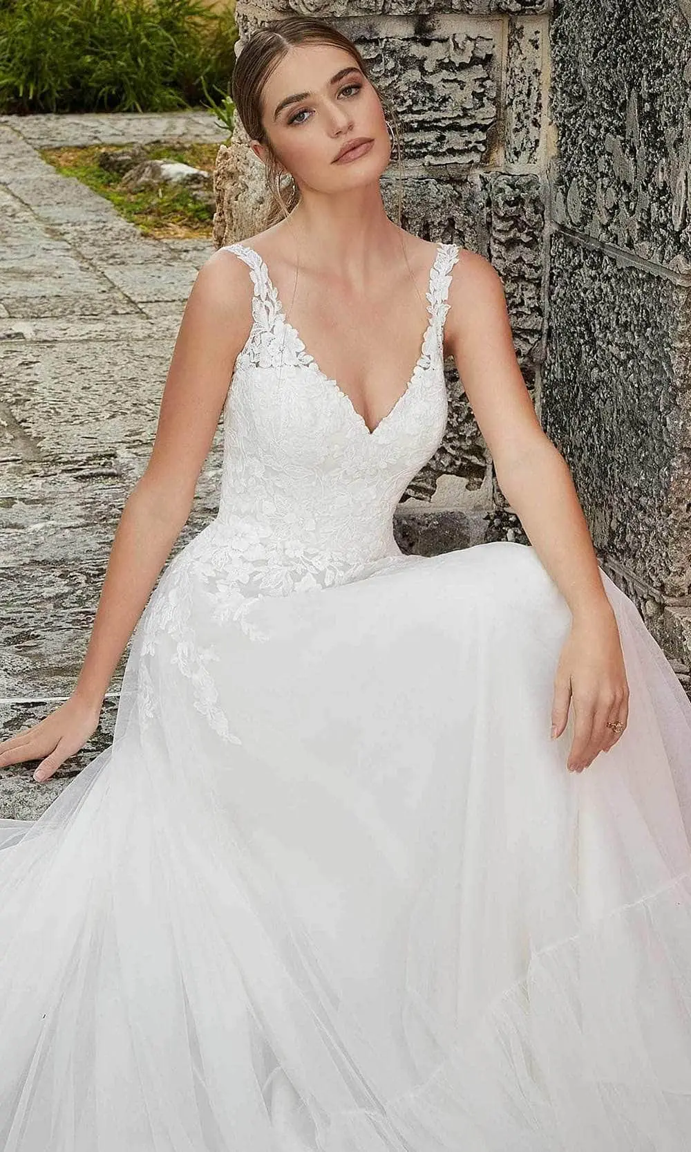 Bloom like the goddess on your wedding day in this Felicita Bridal by Mori Lee 6978 creation. The bodice of this A-line bridal gown is covered in lace embroidery, a V-neckline, and a low V-back that has a keyhole and a thin band. For an added dose of stylistic flair, this gown comes with a bishop sleeves that can be removed. This ruffle hem and chapel train are the perfect finishing touches for this soft net dream wedding dress. Glamour up with captivating style in this Mori Lee bridal creation. Available in three lengths: 55 inches, 58 inches, and 61 inches. Model is wearing Ivory/Champagne/Honey color.
