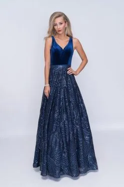 Walk in a defined sophistication and beauty wearing this lovely evening gown by Nina Canacci 1405. The fitted bodice offers a V neckline complemented with an open V back. From the embellished waist reveals a fully sequined a-line skirt that ripples to full length. This Nina Canacci design is sure to bring you an unforgettable romantic evening!
