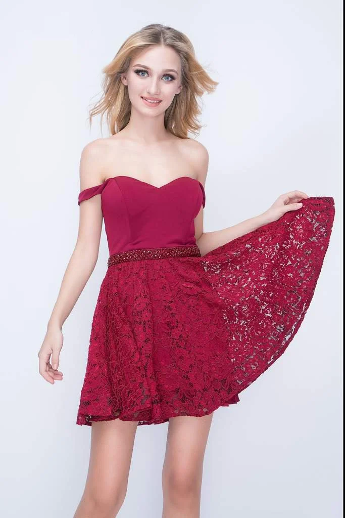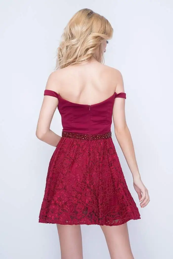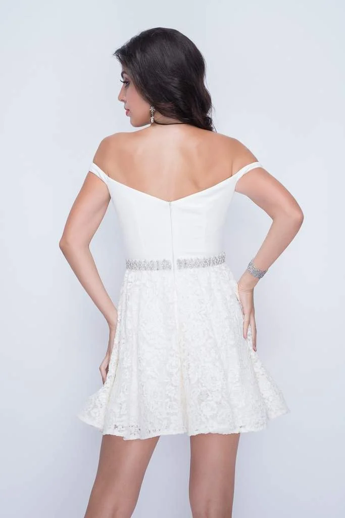 Make him spend the whole night admiring your riveting flair in this exquisite Nina Canacci 219 creation. Sculpted with seams while revealing a delicate sweetheart notch, this stunner shows an off shoulder neckline paired with a wide v-cut open back. Embraced with a gleaming beaded band around the waist, the floral lace A-line skirt cascades in soft waves as it ends in a short hemline. Dance all night long with finesse and beauty in this lovely Nina Canacci masterpiece.