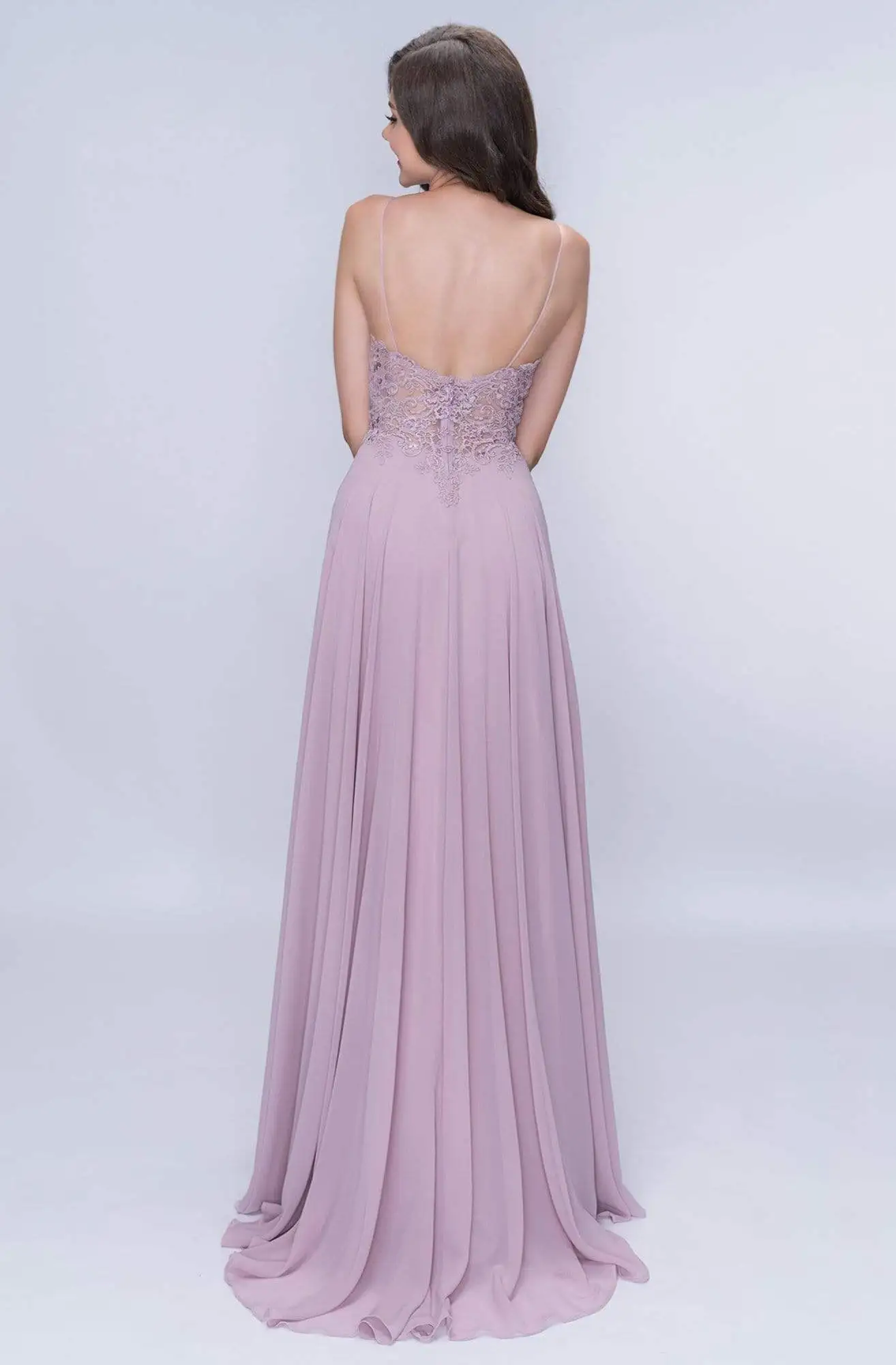 | Details: | Sleeveless, Spaghetti Straps, Illusion Inset, Embroidered Scroll Motif, Rhinestones, Plunging Illusion V-Back, Back Zipper Closure, Full Length Hem |