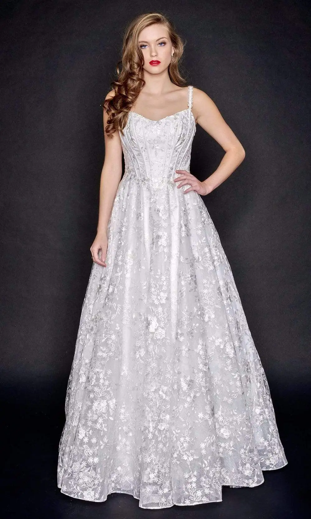 Go beyond beauty in a galactic creation from Nina Canacci 3182. Accented with floral embroidery, this ensemble shows a corset bodice with structured boning. It features a sleeveless, scoop neckline and embellished thin straps trail into the mid-open back with lace-up tie closure. The ballgown skirt blends perfectly elongate as it gorgeously finishes with a court train. This Nina Canacci masterpiece is sure to make you the darling of the party!