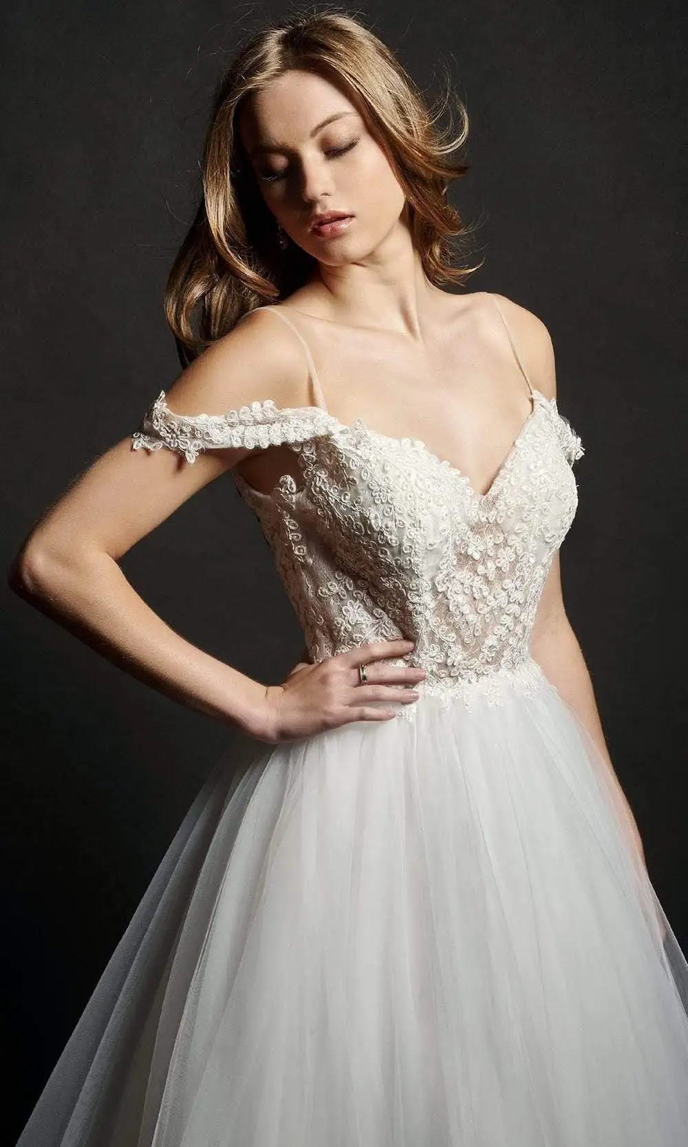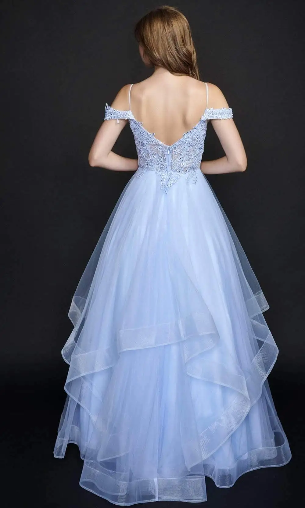 Look like a dream in this iridescent Nina Canacci 5205 creation. Gleaming with beadwork and lace appliques, this gown features an off shoulder neckline with spaghetti straps and draped sleeves. Crafted with a low v-open back, the ethereal skirt creates a layered silhouette as it ends with a floor length hemline. Exude elegance in this Nina Canacci masterpiece.