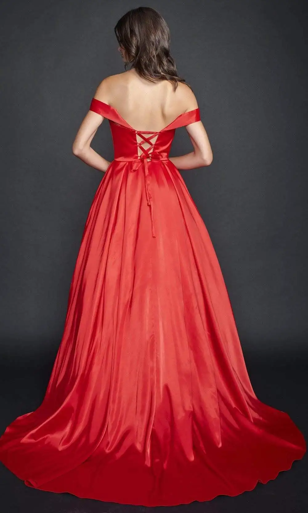 Fall in love with the radiance of this Nina Canacci 5214 creation. Contoured with a sleek silhouette, this gown flatters with an off shoulder neckline with draped sleeves. Defined with a lace up back, the magnificent skirt cascades into a flowing train. Regale a style that is sweet and romantic in this Nina Canacci masterpiece.