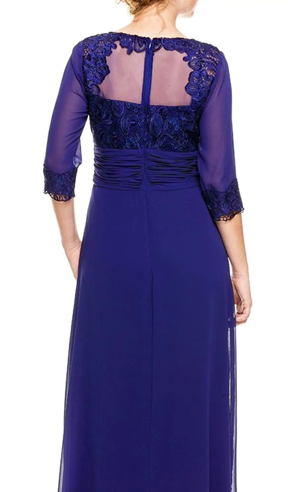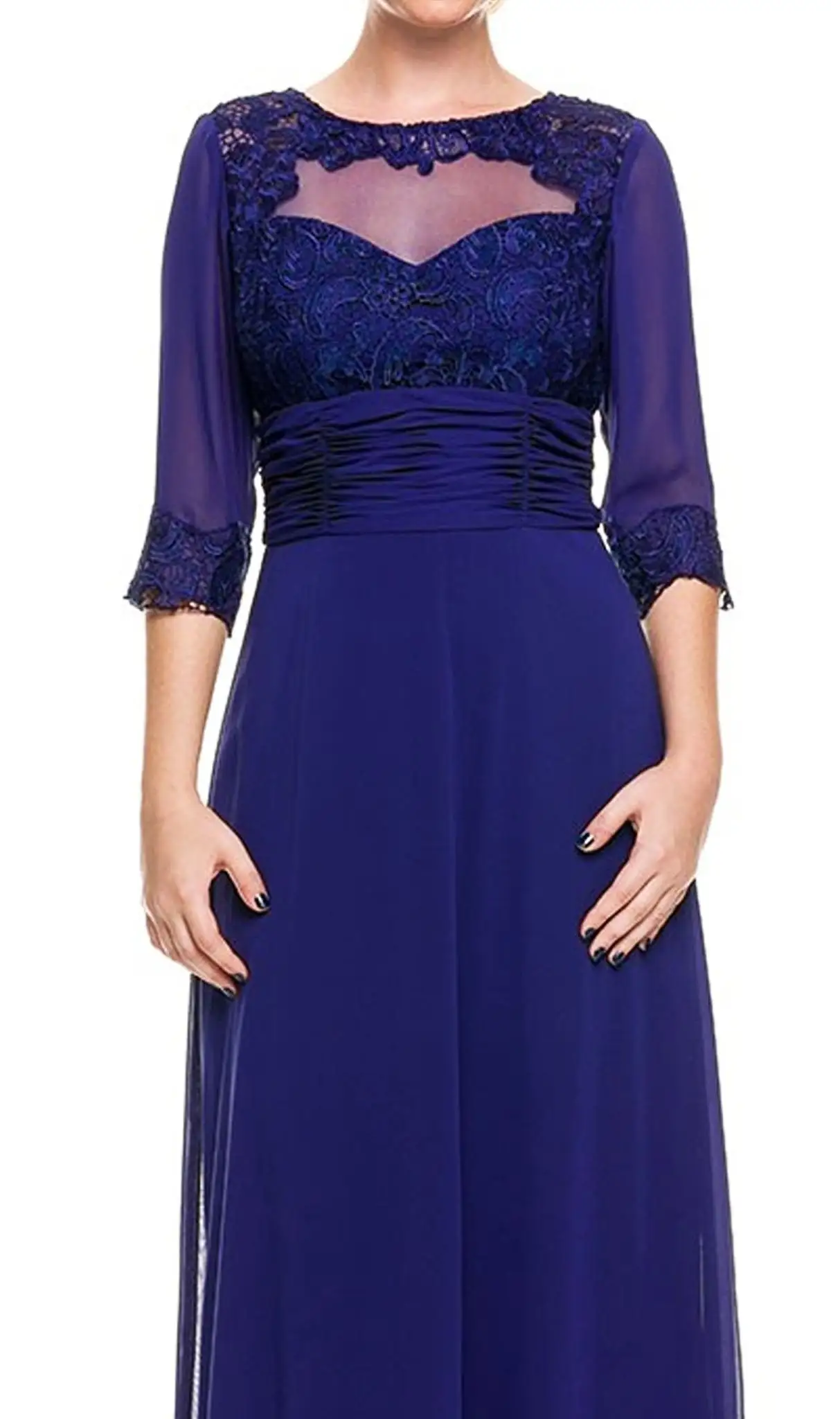 Dance into that classic steps wearing this flattering and elegant look from Nox Anabel 5101 long formal dress. The sheer top bodice features a beautiful lace embroidered jewel neckline and quarter length sleeves. The lace embroidered sweetheart bust is complimented by the wide ruched empire waistband. This brilliant ensemble drapes to the dazzling ankle-length hem with modest flare. This classy look by Nox Anabel is perfect as a Mother of the Bride dress or for any formal event! Models are wearing the Royal Blue and Sand colors.