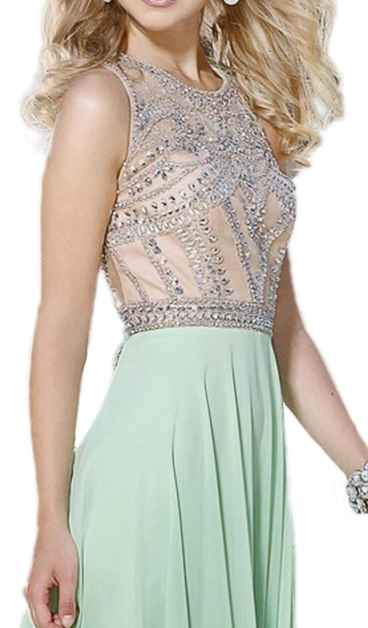 | Details: | Sleeveless, Illusion full back, Back zipper, Chiffon, Sheer fabric, Sweetheart lining, Jewel accents, Beading, Sequins |