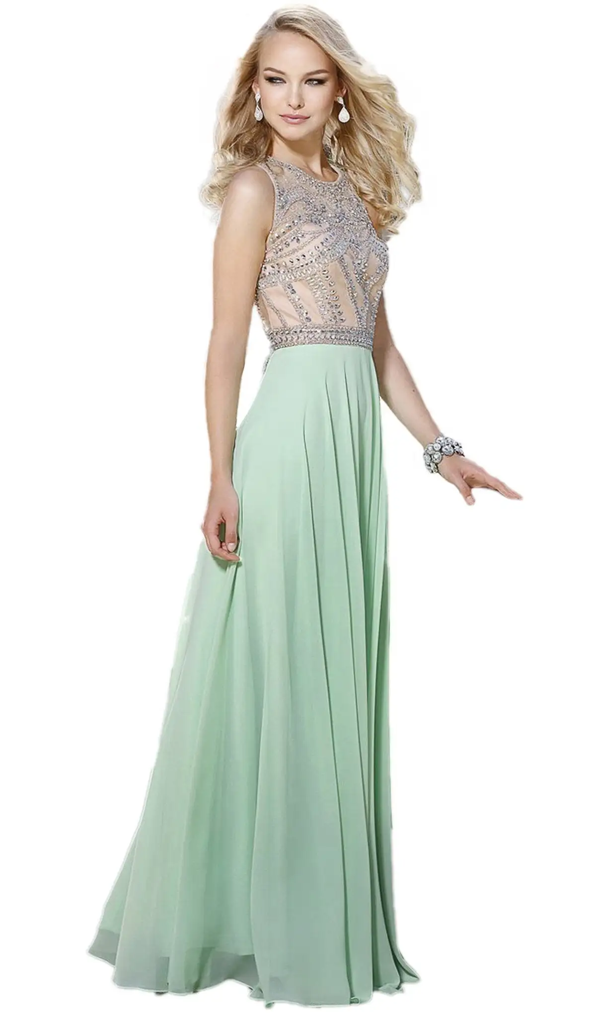 Strike a pose as you enter the room in this exquisite dress by Nox Anabel 8249. The dress brandishes in a sleeveless, sheer scoop neckline with jewel accents over the sweetheart lined bodice and sheer midriff. The back has a zipper closure while the chiffon skirt flares in an A-line silhouette and runs in full length hem. Chic and refined, this dazzling dress by Nox Anabel is a stunning selection for your next black tie affair.