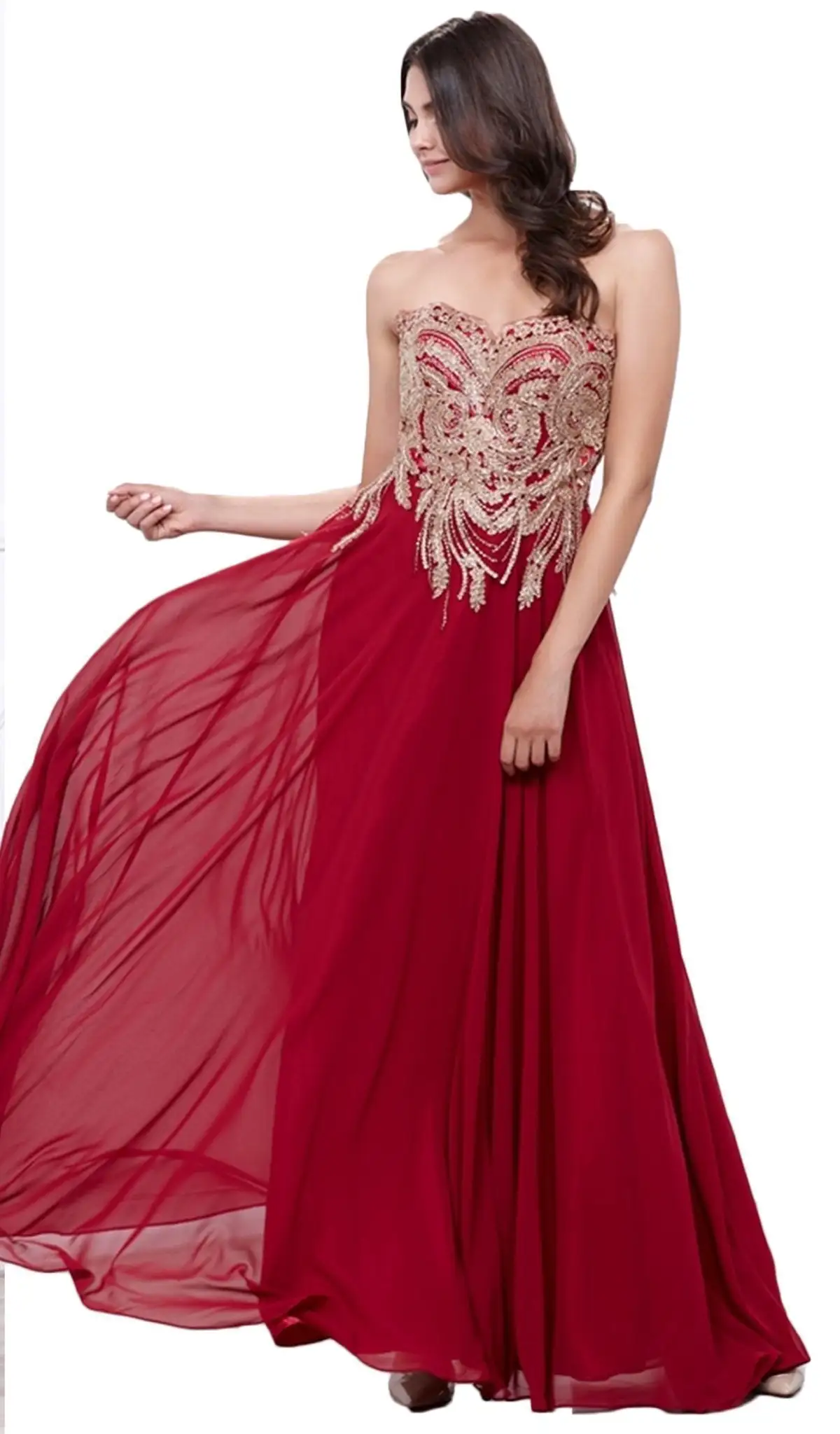 | Details: | Strapless, Lace applique, Floor length , Chiffon fabric, Zip up closure |